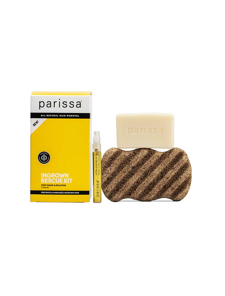 The Parissa Ingrown Rescue Kit 3pc Ingrown Rescue Kit combines three specialised products for comprehensive ingrown hair care. This complete system includes Tea Tree Soap with cleansing properties, an exfoliating Konjac Sponge with finely ground walnut to help remove surface cells, and the Ultra Soothe Oil featuring five essential botanicals to hydrate and comfort the skin. Perfect for use after any hair removal method, this kit helps address ingrown hairs whilst maintaining soft, healthy-looking skin. Made in Canada.