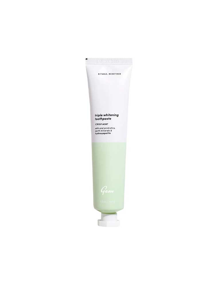 The Gem Triple Whitening Toothpaste in Crisp Mint is a high-performance, fluoride-free whitening toothpaste that delivers a deeper clean for fresher breath and whiter teeth. This toothpaste features science-backed ingredients that deliver a routine with results. The formula whitens without harsh chemicals that can damage your enamel. It includes coconut-derived Hydroxyapatite for enamel remineralisation and Silica for gentle whitening. Includes an oral probiotic to help balance your mouth's microbiome whilst helping reduce plaque build-up and removing surface stains. This crisp and cool mint flavour leaves you with a clean and fresh feeling. Consumer study results show 98% experience zero sensitivity, 100% feel clean and fresh, and 90% see improved tooth brightness in just 14 days. Made in Australia.