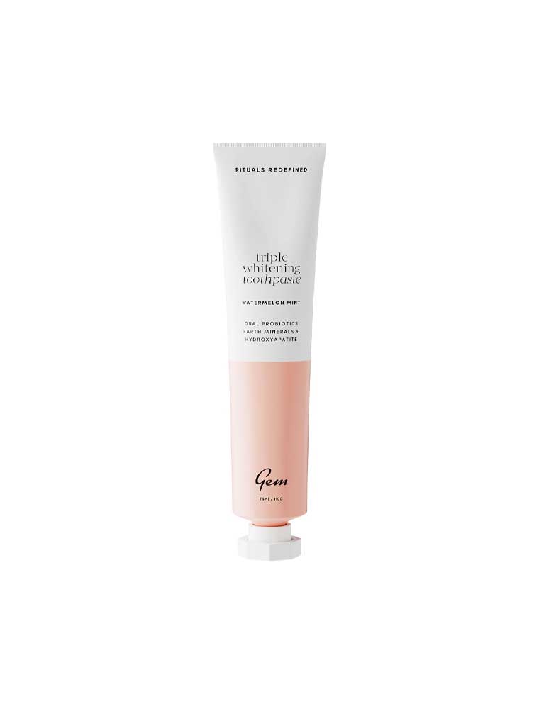 The Gem Triple Whitening Toothpaste in Watermelon Mint is a high-performance, fluoride-free whitening toothpaste that delivers a deeper clean for fresher breath and whiter teeth. This toothpaste features science-backed ingredients that deliver a routine with results. The formula whitens without harsh chemicals that can damage your enamel. It contains coconut-derived Hydroxyapatite for enamel remineralisation and Silica for gentle whitening. Plus probiotic to help balance your mouth's microbiome whilst helping reduce plaque build-up and removing surface stains. This refreshing watermelon flavour is like a watermelon spritz that leaves you with a clean, fresh feeling. Consumer study results show 98% experience zero sensitivity, 100% feel clean and fresh, and 90% see improved tooth brightness in just 14 days. Made in Australia.