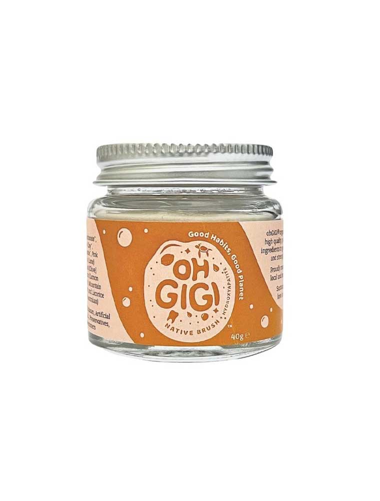 The Hydroxyapatite Tooth Powder 'Native Brush' is an Australian-made natural tooth powder enhanced with 10% micro hydroxyapatite, formulated from high-quality, pure food-grade, and locally sourced mineral-rich biodegradable ingredients. Perfectly flavoured with the right balance of organic Lime, Clove and Lemon Myrtle essential oils with Australian natives Desert Lime and Mountain Pepperberry, creating a zesty and spicy flavour whilst celebrating the power of indigenous superfoods. The micro hydroxyapatite is a natural non-nano compound derived from ethically sourced, Australian-certified BSE-free pasture-fed bovine bone. Each jar contains approximately 200 brushes, equivalent to 2.5 medium-sized toothpaste tubes. Made in Australia and packaged in glass.