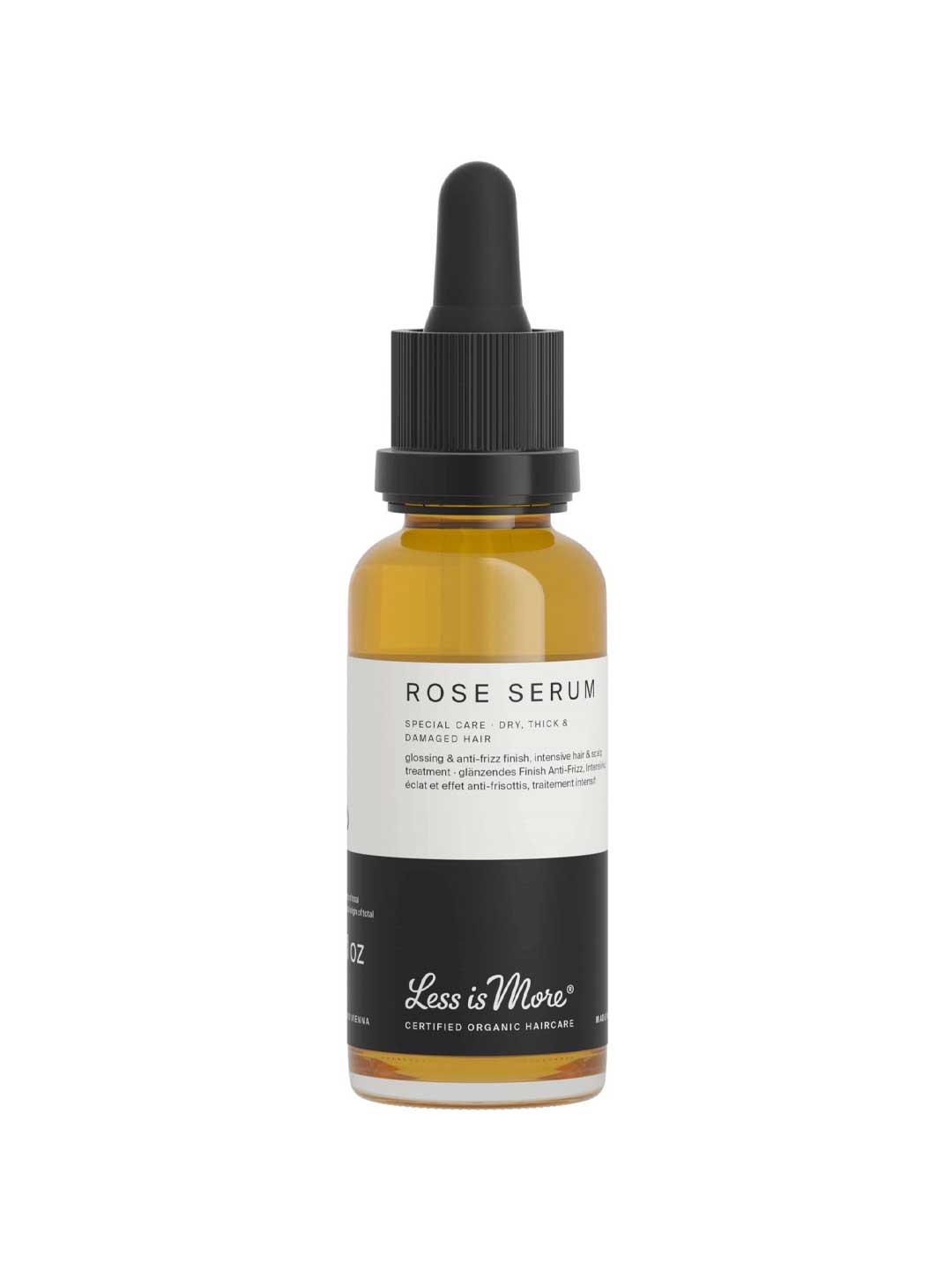 The Less Is More Rose Serum is a luxurious smoothing hair oil designed to provide intensive care for dry, thick, and damaged hair while supporting scalp comfort. A nourishing blend of cold-pressed Rose Hip Oil, Jojoba Oil, Apricot Kernel Oil, Coconut Oil, and Vitamin E helps smooth frizz, enhance natural gloss, and soften the hair structure without heaviness. This rich yet balanced serum can be used as a finishing treatment or an intensive hair and scalp oil to support softness, shine, and overall hair health. Certified organic and vegan, this silicone free serum is sustainably handmade and produced in Vienna, Austria, and scented with 100% certified organic essences of Rose Damascena, Rose Geranium, and Tangerine.
