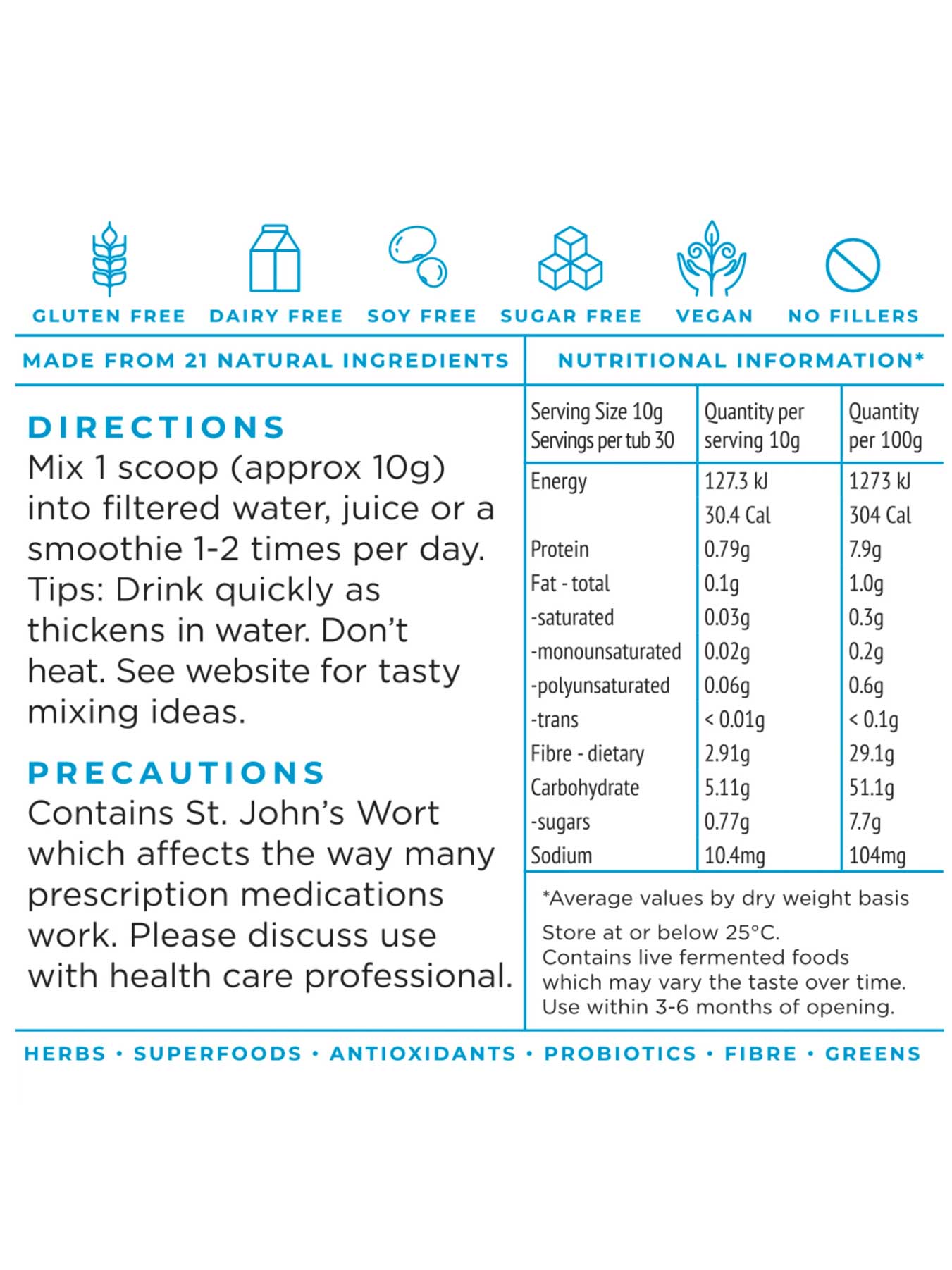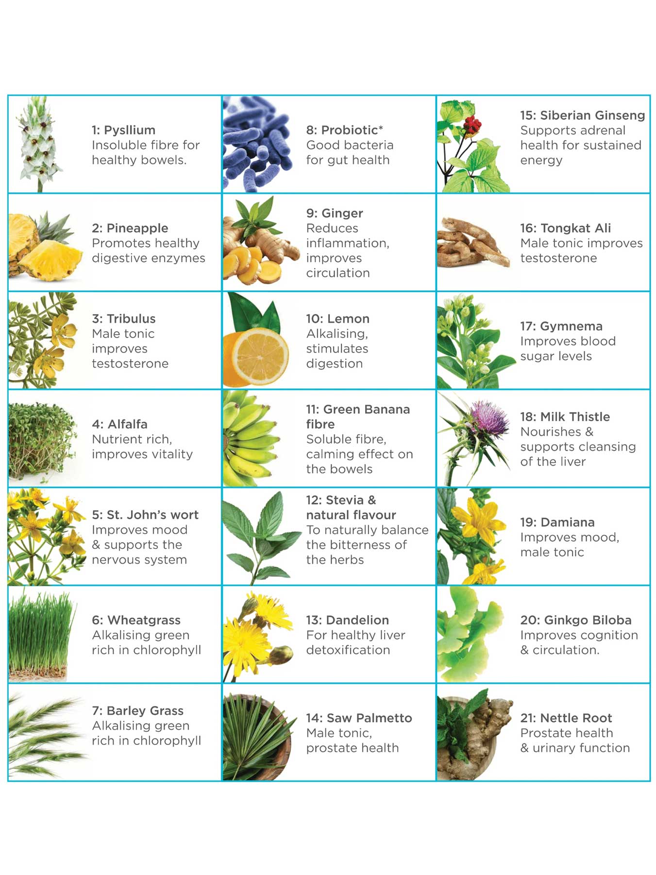 21 Powerful Natural Ingredients: Psyllium (seed husks), Pineapple (fruit), Tribulus (aerial parts), Alfalfa (sprout and seed), St. John’s Wort (flower), Wheatgrass (sprout), Barley Grass (sprout), Multi Strain Probiotic, Ginger (root), Lemon (fruit), Green Banana Fibre (fruit), Stevia (leaf) and natural flavour, Dandelion (root), Saw Palmetto (fruit), Siberian Ginseng (root), Tongkat Ali (root), Gymnema (leaf), Milk Thistle (fruit), Damiana (leaf), Ginkgo Biloba (leaf), Nettle (root).