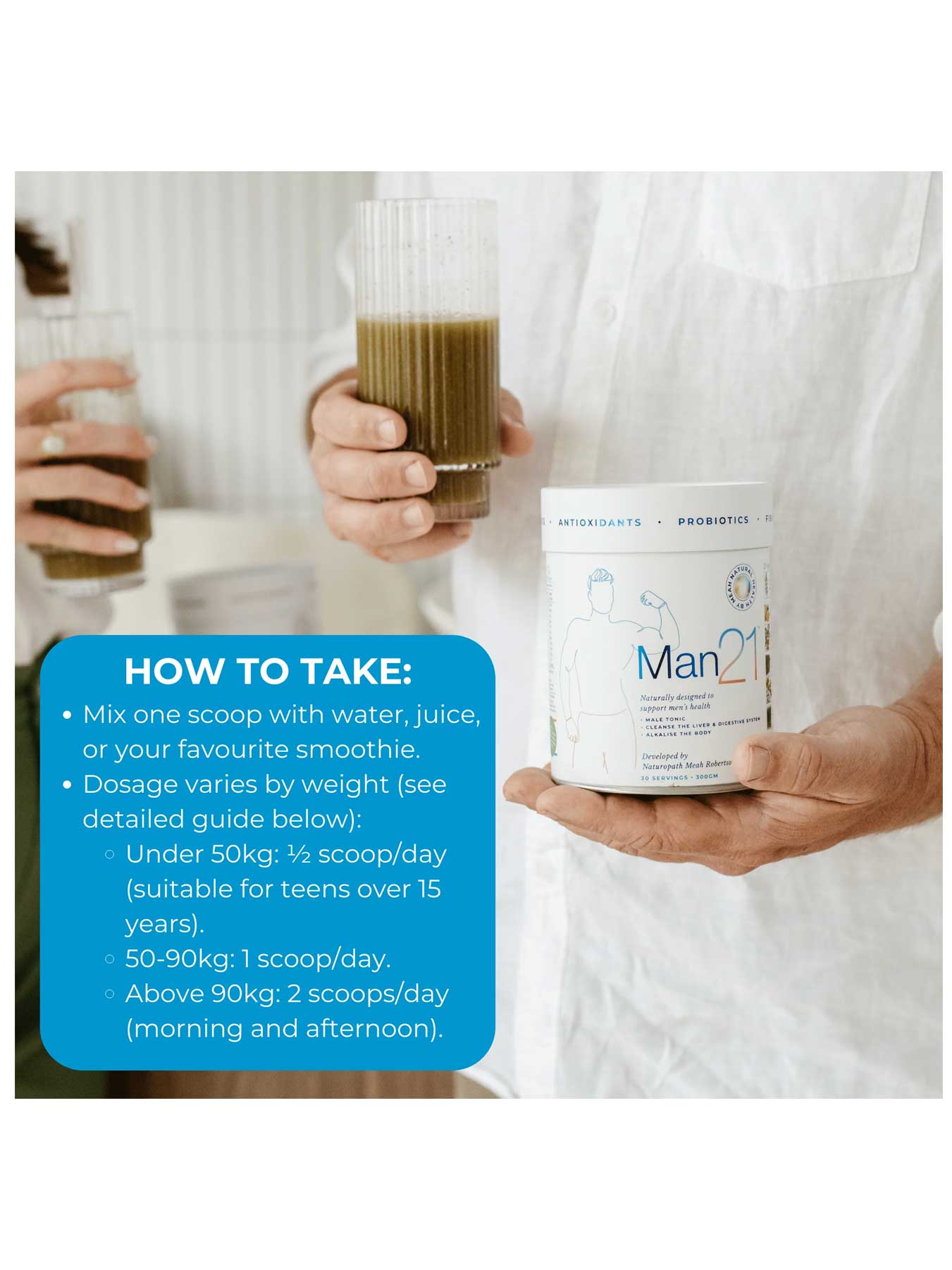 The Natural Health by Meah Man21 is a naturopath formulated wholefood blend made from 21 natural herbs, greens, fibres and antioxidant rich botanicals. Designed as a simple daily routine, this nutrient dense mix supports overall wellbeing with plant based ingredients traditionally used in men’s wellness practices. The blend includes alkalising greens, gut supportive fibres, fermented probiotics and nutrient rich fruits such as pineapple, lemon and green banana. Herbs like tribulus, Siberian ginseng, saw palmetto, milk thistle, nettle root and damiana have long histories of traditional use in men’s vitality and lifestyle support. Together, these botanicals offer a gentle way to increase your intake of nutrient dense plants and natural superfoods.