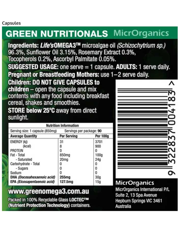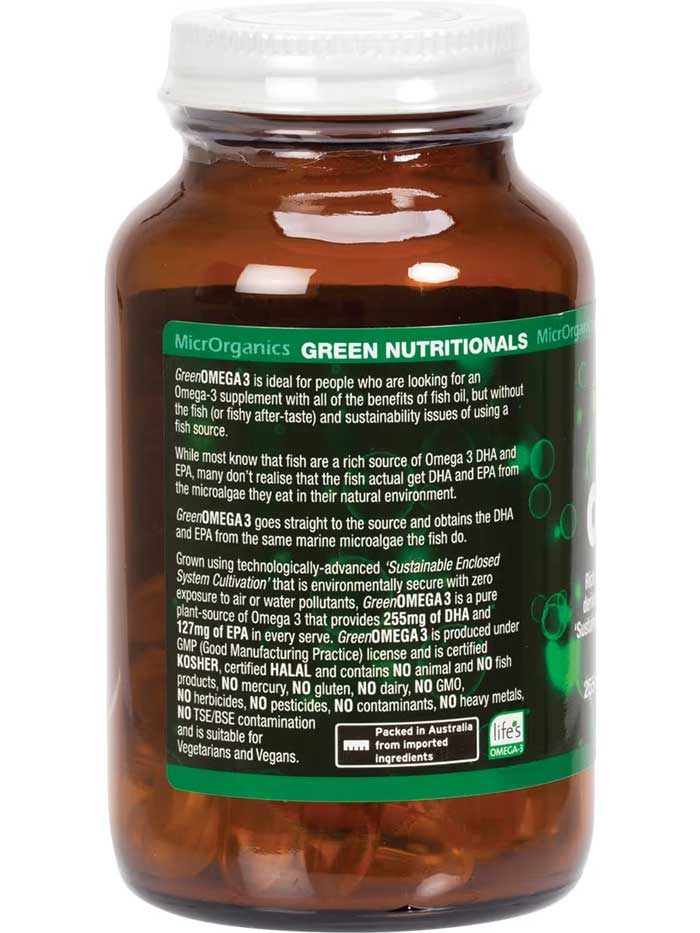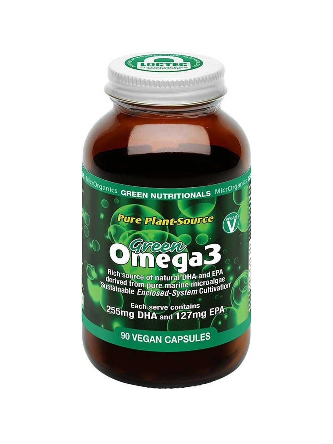 The Green Nutritionals Vegan Omega 3 provides essential fatty acids from organic marine microalgae, bypassing fish to access a plant-based source of DHA and EPA. This renewable algal formula is produced with minimal environmental impact and contains none of the heavy metals sometimes found in fish-based products. DHA and EPA are important nutrients that can be included as part of a balanced diet and healthy lifestyle. Made in Australia and vegan. 90 day supply.