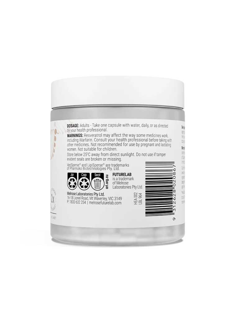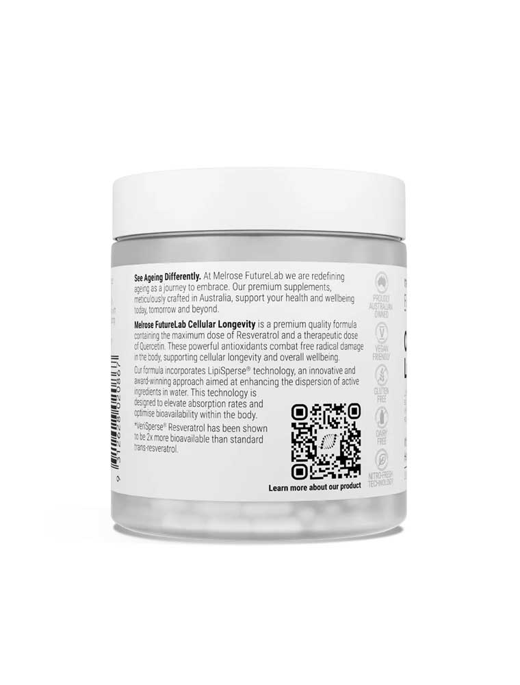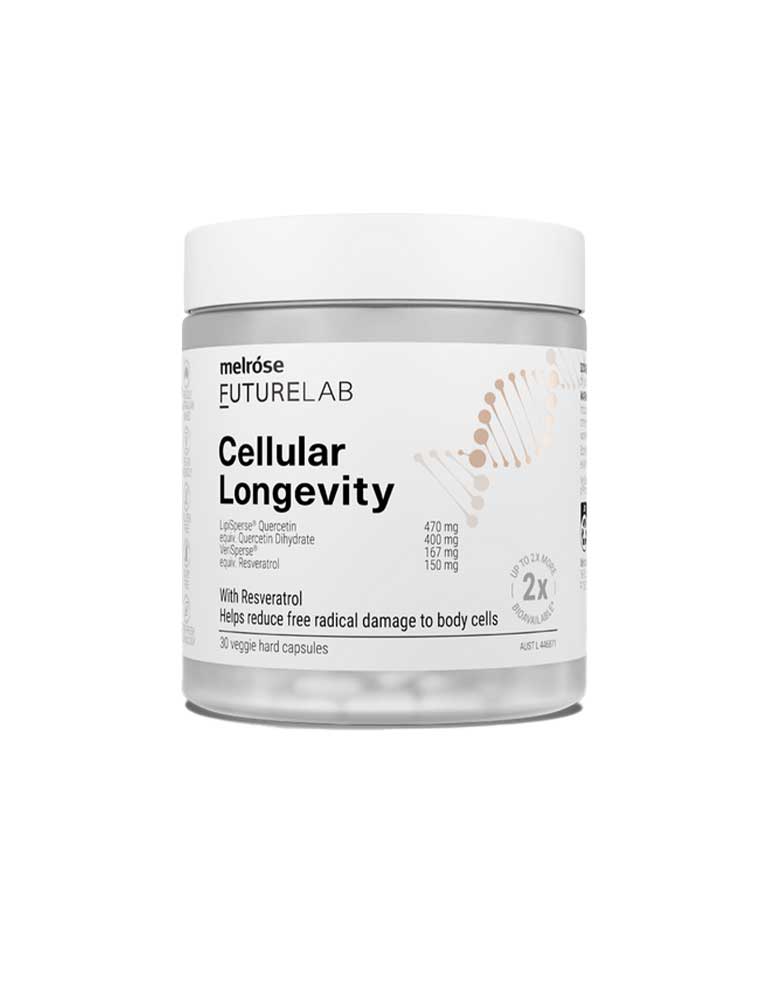 The Melrose FutureLab Cellular Longevity contains maximum dose Resveratrol and therapeutic dose Quercetin to combat free radical damage. Features VeriSperse Resveratrol with LipiSperse technology, shown to be twice more bioavailable than standard trans-resveratrol for improved absorption. Made in Australia. TGA Listed (AUST L 446871). ALWAYS READ THE LABEL AND USE ONLY AS DIRECTED. If symptoms persist, talk to your health professional.