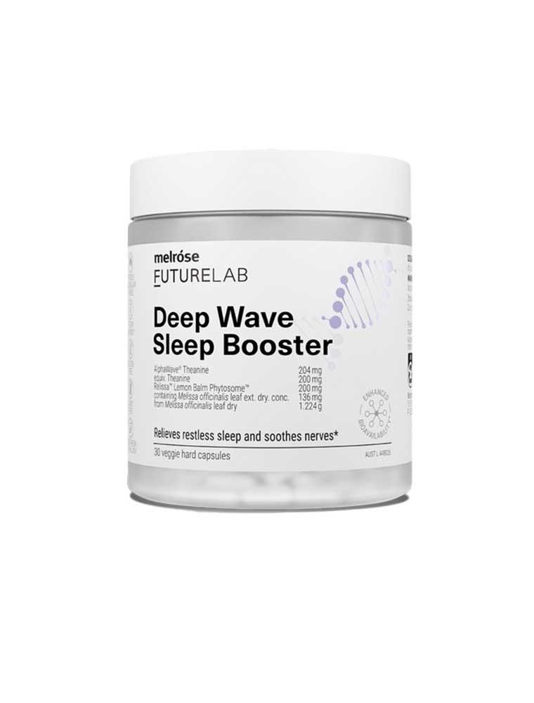 The Melrose FutureLab Deep Wave Sleep Booster contains Relissa Melissa officinalis, traditionally used in Western Herbal Medicine to relieve restless sleep and soothe nerves, plus Alphawave L-Theanine to calm the mind, support nervous system health, and decrease symptoms of stress. Made in Australia. TGA Listed (AUST L 448026). ALWAYS READ THE LABEL AND USE ONLY AS DIRECTED. If symptoms persist, talk to your health professional.