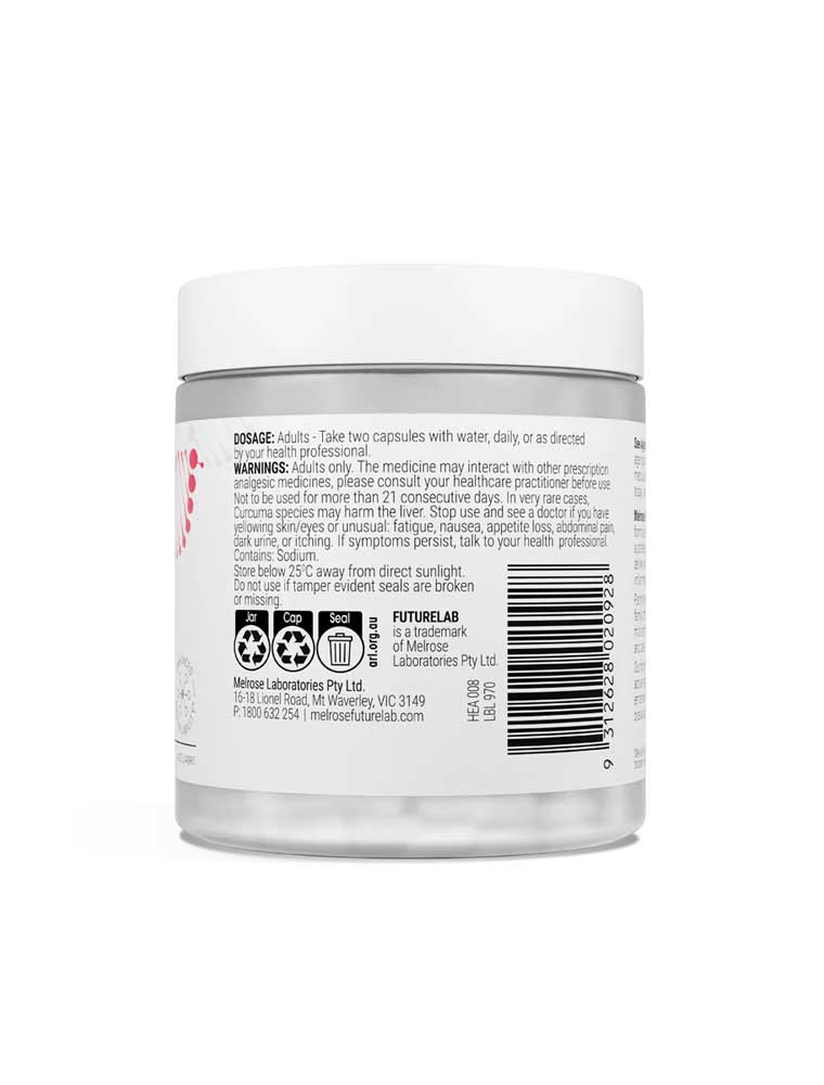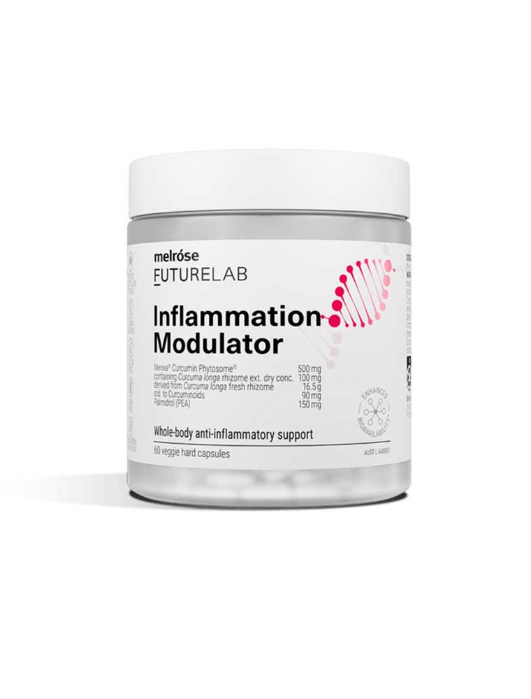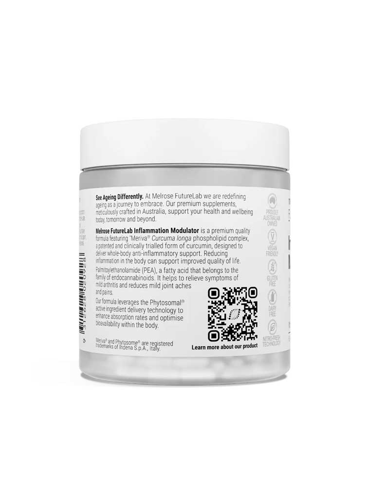 The Melrose FutureLab Inflammation Modulator features Meriva Curcuma longa complex and Palmitoylethanolamide (PEA) to relieve inflammation, decrease mild joint aches and pains, and symptoms of mild arthritis. Provides antioxidant protection by reducing free radicals formed in the body. Made in Australia. TGA Listed (AUST L 448951). ALWAYS READ THE LABEL AND USE ONLY AS DIRECTED. If symptoms persist, talk to your health professional.