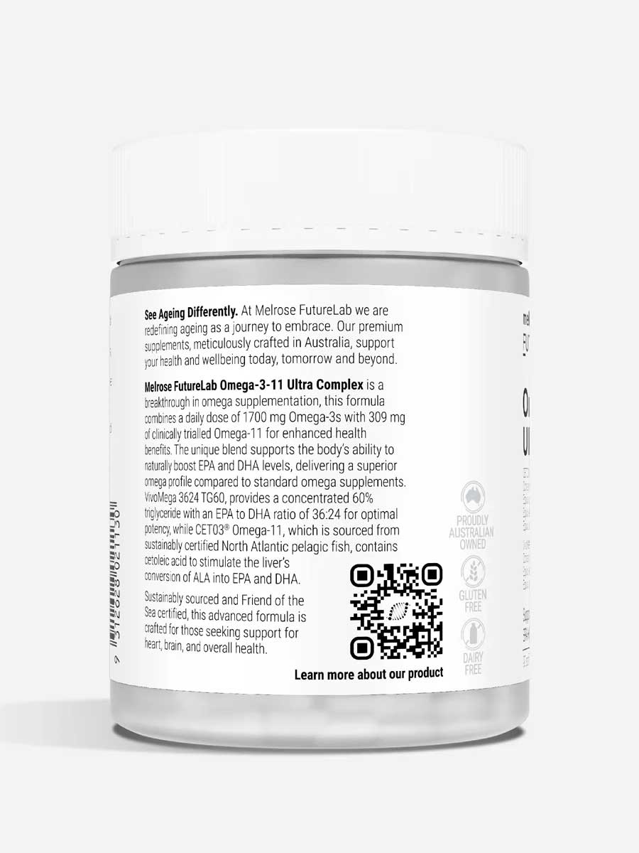 The Melrose FutureLab Omega-3-11 Ultra Complex delivers a concentrated blend of EPA, DHA and clinically studied cetoleic acid from sustainably sourced marine lipids. This advanced formula provides a daily dose of 1,700 mg omega 3s with 309 mg omega 11 to support heart health, brain function, eye health and overall wellbeing. The unique combination helps maintain omega 3 status in the body by supporting natural EPA and DHA synthesis for a more efficient omega profile. Made with Friend of the Sea certified fish oils and crafted for those seeking premium omega support. Made in Australia. TGA Listed (AUST L 486067). ALWAYS READ THE LABEL AND USE ONLY AS DIRECTED. If symptoms persist, talk to your health professional. 90 soft capsules, 30 day supply.