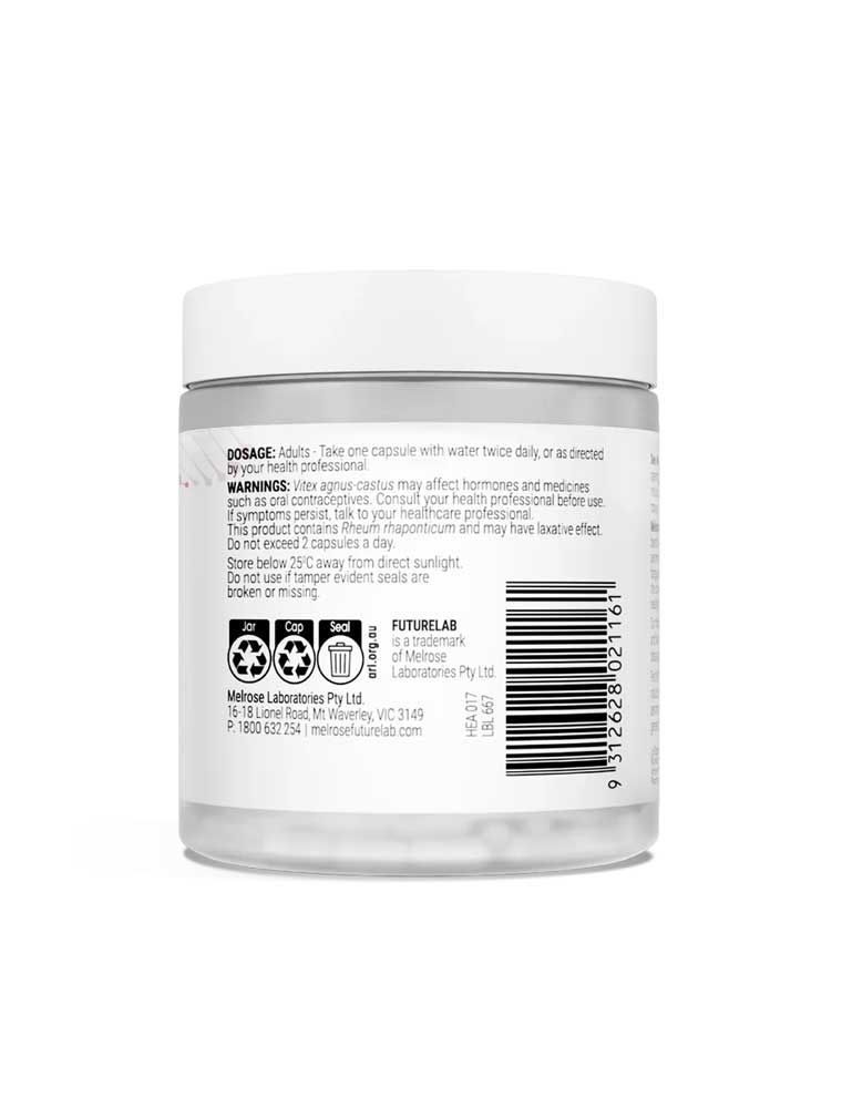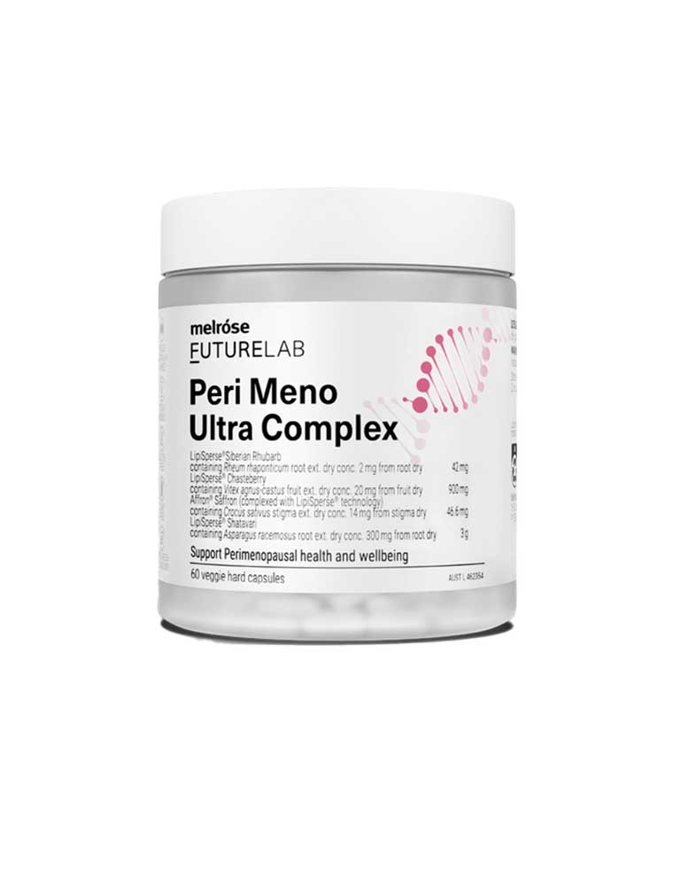 The Melrose FutureLab Peri Meno Ultra Complex supports up to 11 perimenopausal symptoms including hot flushes, restless sleep, fatigue, muscle soreness, irritability and vaginal dryness. Contains Affron to promote healthy mood balance and reduce symptoms of mild anxiety while maintaining general health and emotional wellbeing in perimenopausal women. Made in Australia. TGA Listed (AUST L 462354). ALWAYS READ THE LABEL AND USE ONLY AS DIRECTED. If symptoms persist, talk to your health professional.