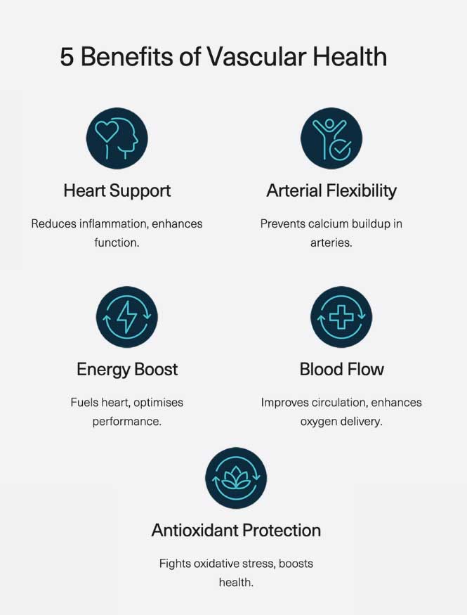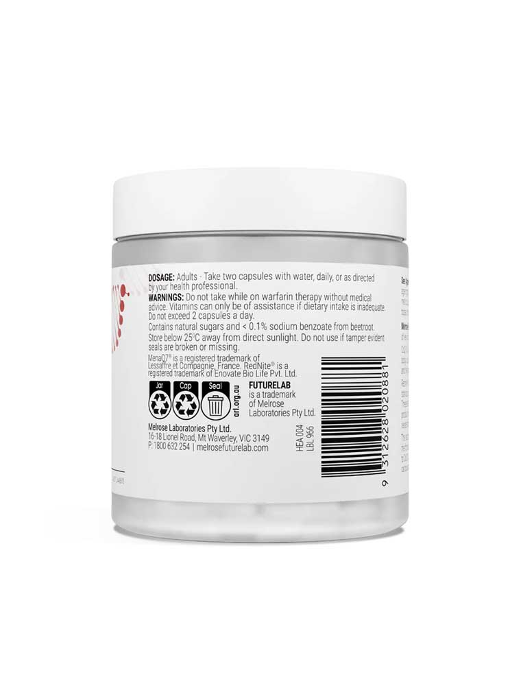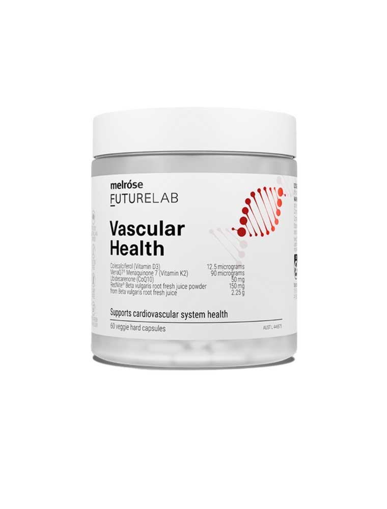 The Melrose FutureLab Vascular Health contains CoQ10 to reduce free radicals and support energy production, Rednite beetroot for nitric oxide support, and Vitamins D3 and K2 to maintain bone health and strength. Supports cardiovascular system health and overall wellbeing. Made in Australia. TGA Listed (AUST L 451258). ALWAYS READ THE LABEL AND USE ONLY AS DIRECTED. If symptoms persist, talk to your health professional.