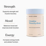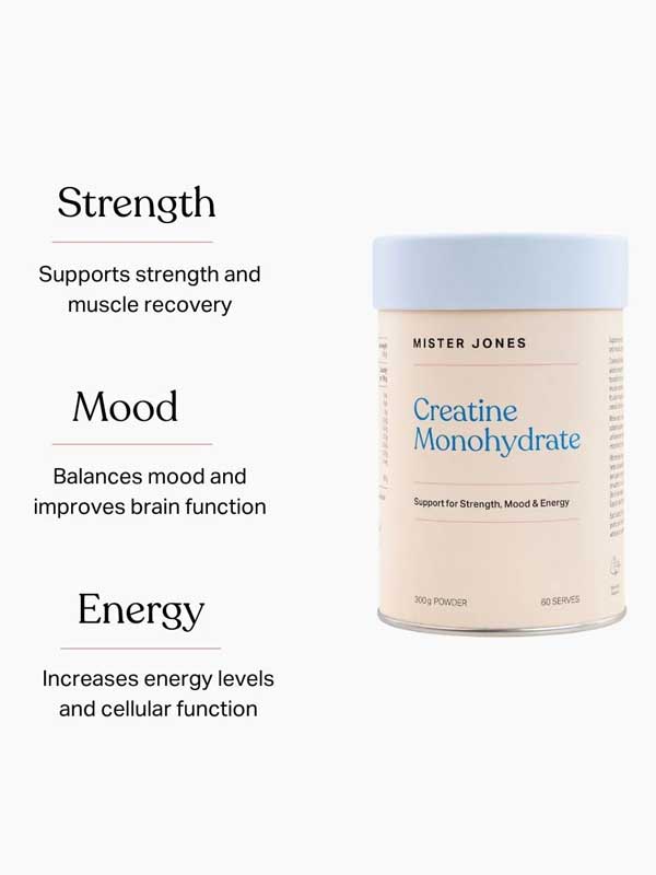 The Mister Jones Creatine Monohydrate is one of the most widely researched supplements in the world, trusted for its role in physical performance, muscle recovery, and cellular energy. Formulated for all-round performance, this creatine is designed to support strength, energy, and mental clarity, helping you feel strong in body and focused in mind. Contains 5,000mg recommended creatine per serve to enhance muscle strength, support muscle mass and bone density, improve mental clarity and cognitive function, and support mood balance. This 100% pure formula has no excipients or fillers, is unflavoured for versatile use, micronised for increased bioavailability, and third-party tested for purity. Creatine increases your body's natural energy production by replenishing ATP, your cells' primary power source, while fueling your brain for mental clarity, focus, and mood balance. Made in Australia and vegan.