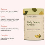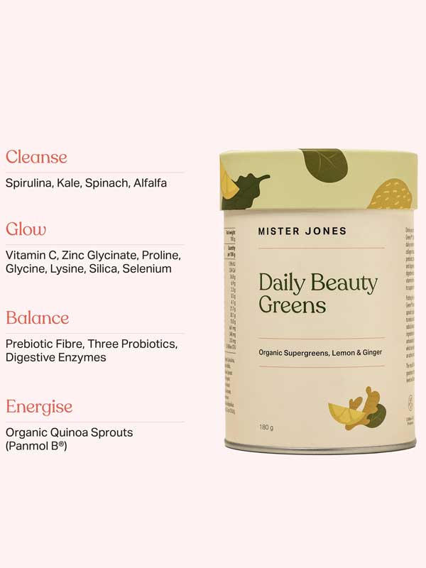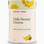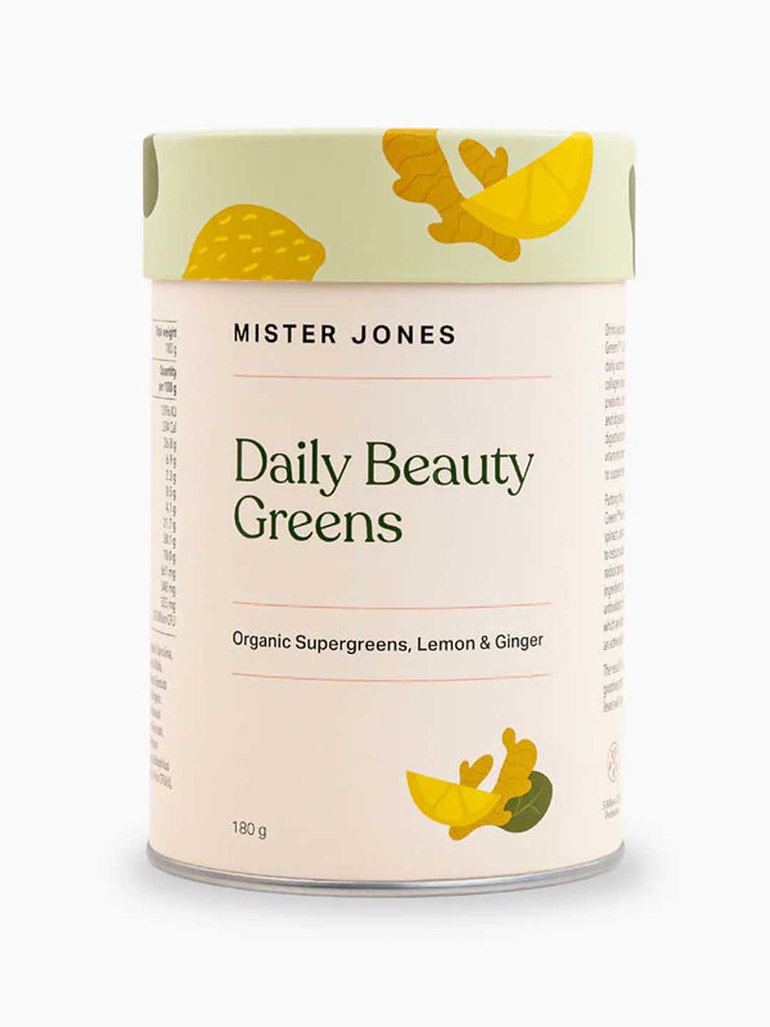 The Mister Jones Daily Beauty Greens is a naturopath-crafted supergreens powder made with organic greens, vegan collagen boosters, probiotics and quinoa sprouts. This refreshing lemon and ginger blend helps support daily nutrition, skin vitality and gut balance while offering a clean, natural taste. Formulated with spirulina, kale, spinach and alfalfa for antioxidant-rich nourishment, it provides an easy everyday ritual to maintain overall wellbeing. Free from dairy, soy, gluten and artificial sweeteners (always double check the label in case of ingredient changes and allergen warnings). Each 180g pack provides 30 serves. Made in Australia, vegan and packaged plastic-free.