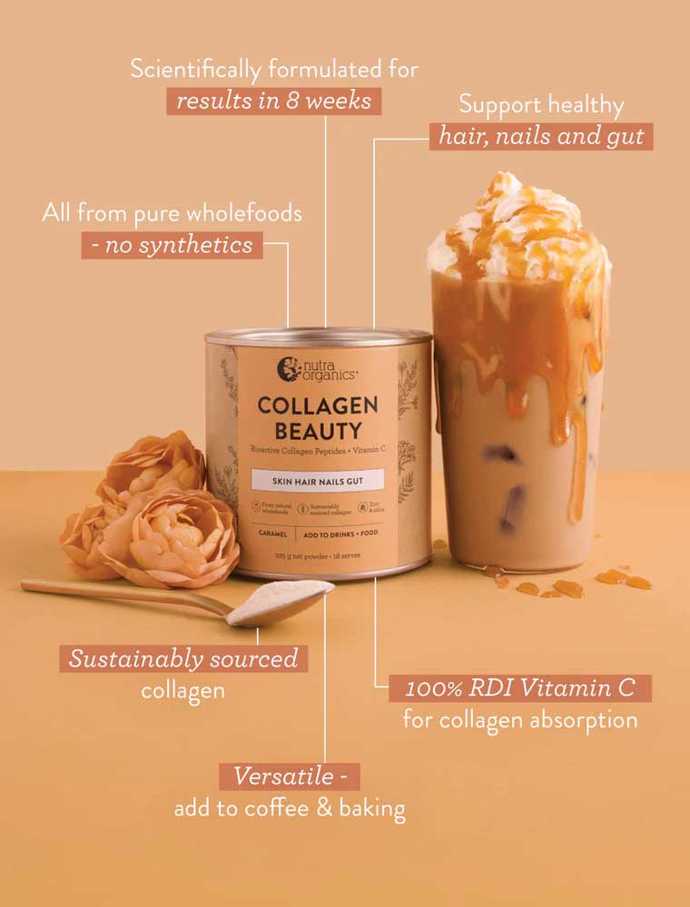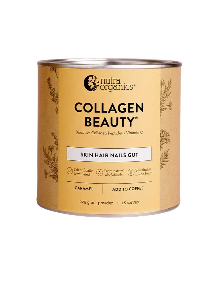 The Nutra Organics Collagen Beauty Caramel is a natural collagen supplement with a deliciously rich caramel flavour. Formulated with VERISOL® Bioactive Collagen Peptides and 100% RDI Vitamin C, this supplement works to plump skin, support skin hydration and elasticity, plus support healthy hair, nails and gut. The caramel flavour is created with natural plant-based flavours and real maple syrup (2%), making it a naturally delicious, low sugar, non-dairy way to enjoy collagen in coffee, drinks and food. Additional ingredients include wildcrafted sea buckthorn juice providing essential Vitamin C, bamboo stem extract for silica, and organic guava leaf extract for zinc. This comprehensive beauty supplement is perfect for those who prefer a sweet, indulgent flavour while receiving all the benefits of collagen for skin regeneration.