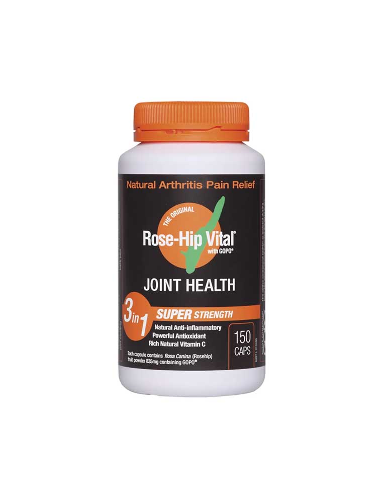 The Rose-Hip Vital® with GOPO® Arthritis Pain Relief Capsules are a unique plant-based product scientifically and clinically proven to improve joint health and wellbeing. Made from pure and natural Rosehip berries, farmed free from pesticides, it's a natural anti-inflammatory, powerful antioxidant, and rich source of Vitamin C. Backed by over 30 scientific studies, including 9 double-blind placebo-controlled trials, it may help relieve pain and symptoms associated with mild Osteoarthritis, temporarily relieve joint inflammation/swelling and pain/aches associated with mild Arthritis, and improve joint mobility in mild Arthritis. The patented GOPO® compound works by stopping excess white blood cells from gathering around inflamed tissue, helping to break the cycle of inflammation and protect cartilage. Made in Australia. TGA Listed (AUST L 91041). ALWAYS READ THE LABEL AND FOLLOW THE DIRECTIONS FOR USE. If symptoms persist, talk to your health professional.
