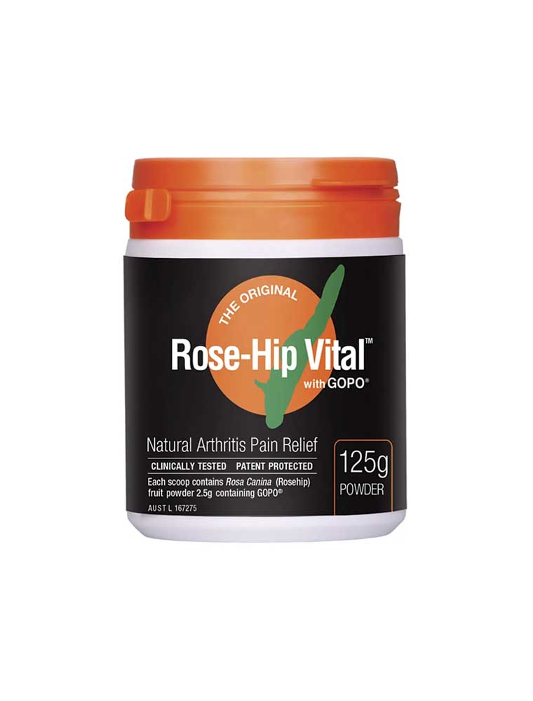 The Rose-Hip Vital® with GOPO® Arthritis Pain Relief Powder is the original version. This is a unique plant-based product scientifically and clinically proven to improve joint health and wellbeing. Made from pure and natural Rosehip berries, farmed free from pesticides, it's a natural anti-inflammatory, powerful antioxidant, and rich source of Vitamin C. Backed by over 30 scientific studies, including 9 double-blind placebo-controlled trials, it may help relieve pain and symptoms associated with mild Osteoarthritis, temporarily relieve joint inflammation/swelling and pain/aches associated with mild Arthritis, and improve joint mobility in mild Arthritis. The patented GOPO® compound works by stopping excess white blood cells from gathering around inflamed tissue, helping to break the cycle of inflammation and protect cartilage. Made in Australia and vegan. TGA Listed (AUST L 167275). ALWAYS READ THE LABEL AND FOLLOW THE DIRECTIONS FOR USE. If symptoms persist, talk to your health professional. Made in Australia and vegan.