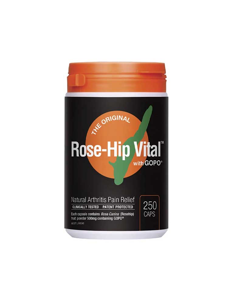 The Rose-Hip Vital® with GOPO® Arthritis Pain Relief Super Strength Capsules are a unique plant-based supplement scientifically and clinically proven to improve joint health and wellbeing. Made from pure and natural Rosehip berries, farmed free from pesticides, it's a natural anti-inflammatory, powerful antioxidant, and rich source of Vitamin C. Backed by over 30 scientific studies, including 9 double-blind placebo-controlled trials, it may help relieve pain and symptoms associated with mild Osteoarthritis, temporarily relieve joint inflammation/swelling and pain/aches associated with mild Arthritis, and improve joint mobility in mild Arthritis. The patented GOPO® compound works by stopping excess white blood cells from gathering around inflamed tissue, helping to break the cycle of inflammation and protect cartilage. Made in Australia. TGA Listed (AUST L 212495). ALWAYS READ THE LABEL AND FOLLOW THE DIRECTIONS FOR USE. If symptoms persist, talk to your health professional.