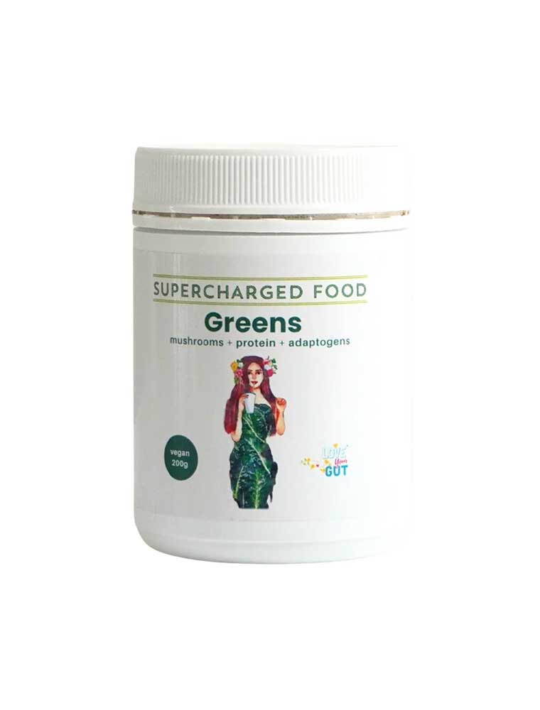 The Supercharged Food Love Your Gut Greens Gut Loving Powder is the ultimate blend for gut health and whole-body wellness, designed to supercharge your gut and overall health. This powerhouse supplement combines greens, mushrooms, protein and adaptogens to nourish your gut and support your entire system. The comprehensive formula supports gut health with prebiotic fibre and digestive enzymes that promote a healthy gut microbiome, whilst medicinal mushrooms and echinacea boost immunity to strengthen your body's defences. Green tea and yerba mate provide natural, sustained energy whilst chlorella and spirulina support your body's natural detoxification processes. This nutrient-dense blend feeds your microbiota and provides natural energy with Vitamin C. Developed by Lee Holmes, Clinical Nutritionist. Made in Australia and vegan.