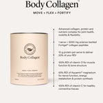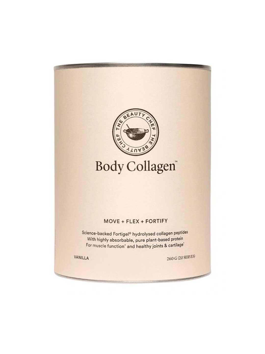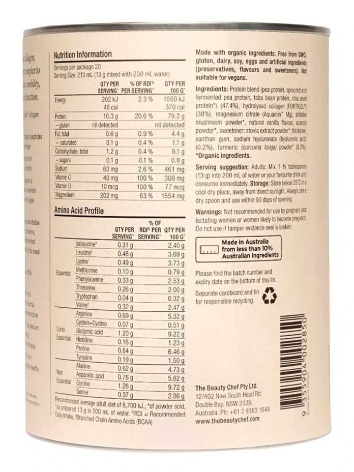 The Beauty Chef Body Collagen Vanilla is an advanced collagen, protein and nutrient complex featuring science-backed Fortigel derived from type II hydrolysed collagen peptides. Each serve delivers 5000mg of Fortigel collagen peptides to support healthy joints, cartilage and ligaments, plus 10g of protein from organic sprouted and fermented pea, chia seed and faba bean proteins. Enhanced with 100% RDI of vitamin D from shiitake mushroom, Aquamin magnesium, fermented hyaluronic acid, and vitamin C from acerola cherry to support collagen synthesis and whole-body skin health. Made in Australia and suitable for keto and paleo diets. Plastic free packaging. Each 320g tub = 20 serves
