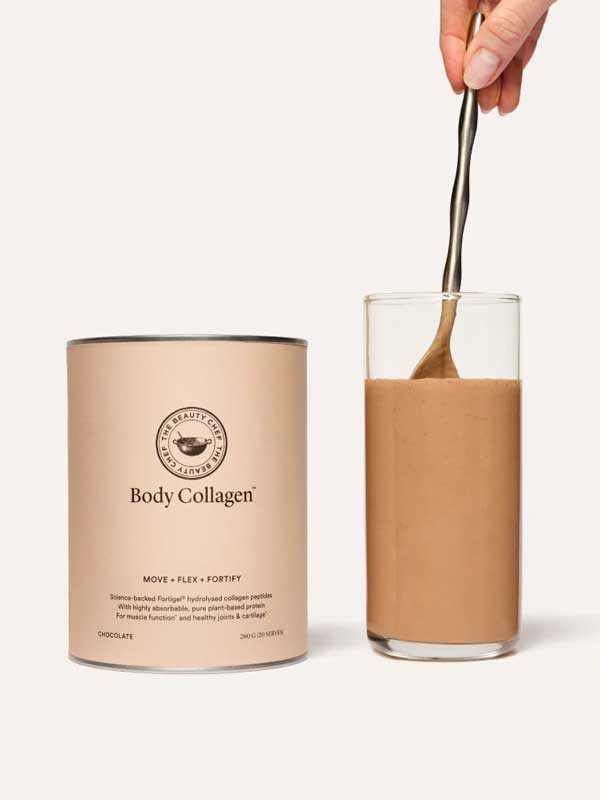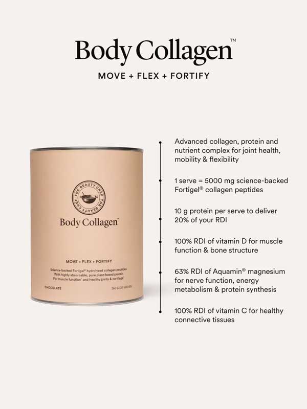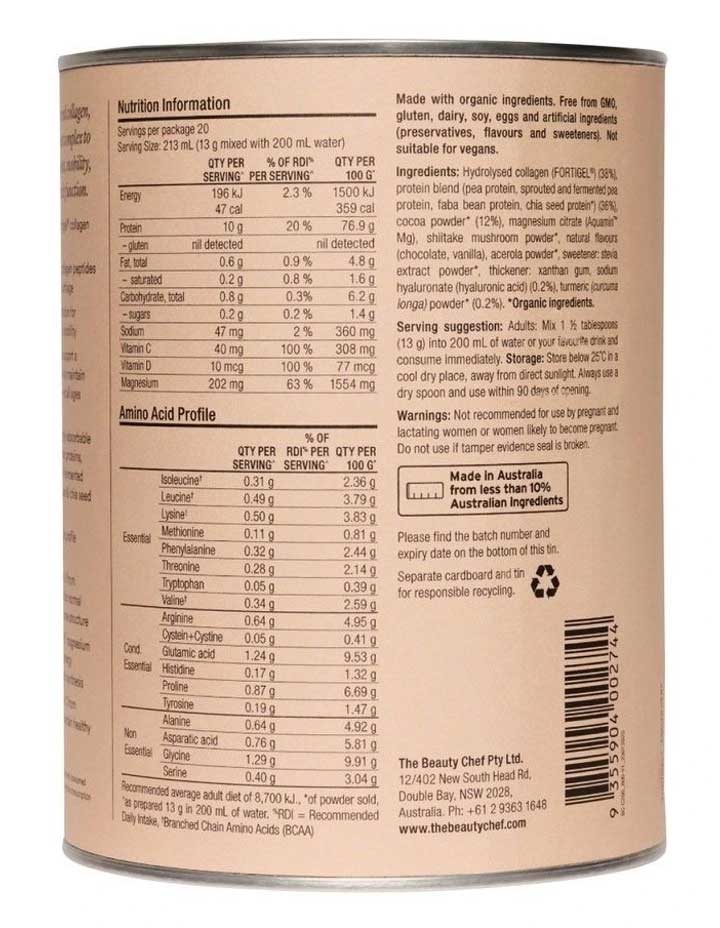 The Beauty Chef Body Collagen Chocolate is an advanced collagen, protein and nutrient complex featuring science-backed Fortigel derived from type II hydrolysed collagen peptides. Each serve delivers 5000mg of Fortigel collagen peptides to support healthy joints, cartilage and ligaments, plus 10g of protein from organic sprouted and fermented pea, chia seed and faba bean proteins. Enhanced with 100% RDI of vitamin D from shiitake mushroom, Aquamin magnesium, fermented hyaluronic acid, vitamin C from acerola cherry, and antioxidant-rich turmeric and cacao. Made in Australia and suitable for keto and paleo diets. Plastic free packaging. Each 320g tub = 20 serves