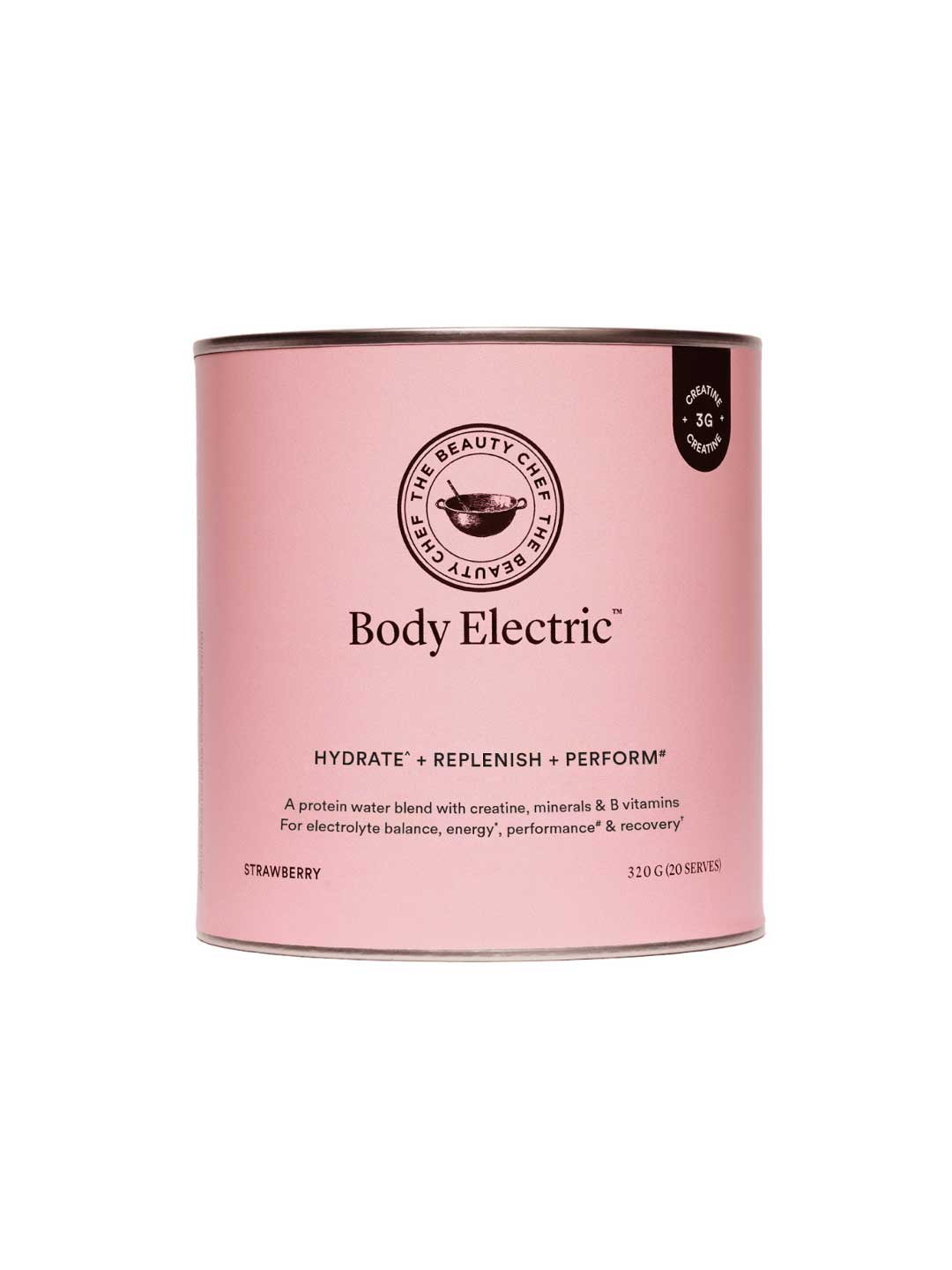 The Beauty Chef Body Electric is a strawberry-flavoured protein water blend designed to recharge and help you perform at your best. Powered by 3g water-washed Creatine, essential electrolytes, 10g hydrolysed plant protein, and a B Vitamin complex to support deep hydration when consumed with water, energy, physical performance, mental stamina and recovery. Features a full spectrum of B Vitamins including Quatrefolic Folate and activated B6 and B12 to help reduce fatigue. Enhanced with Coconut Water, Beetroot and gut-friendly fermented Kombucha, this fully dissolvable formula can be consumed before, during or after movement. Made in Australia and suitable for vegan and keto diets. Plastic free packaging. Each 320g tub = 20 serves