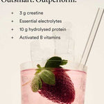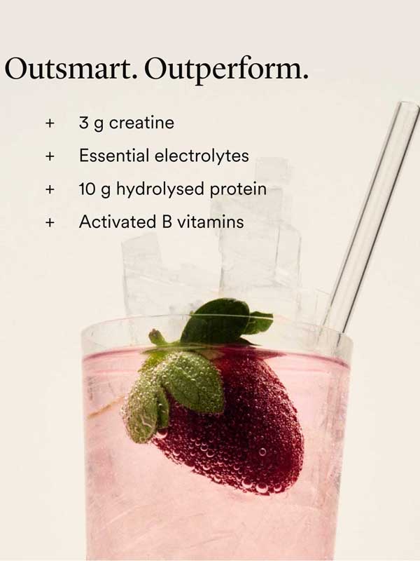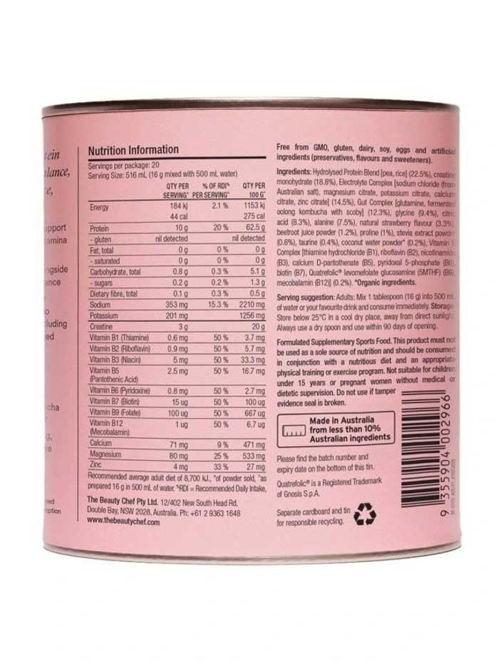 Hydrolysed Protein Blend [pea, rice] (22.5%), creatine monohydrate (18.8%), Electrolyte Complex [sodium chloride (fromAustralian salt), magnesium citrate, potassium citrate, calcium citrate, zinc citrate] (14.5%), Gut Complex™ [glutamine, fermented oolong kombucha with scoby] (12.3%), glycine (9.4%), citric acid (8.3%), alanine (7.5%), natural strawberry flavour(3.3%),beetroot juice powder (1.2%), proline (1%), stevia extract powder(0.6%), taurine (0.4%),coconut water powder* (0.2%), Vitamin B Complex [thiamine hydrochloride (B1), riboflavin (B2),nicotinamide(B3), calcium D-pantothenate (B5), pyridoxal 5-phosphate (B6),biotin (B7),Quatrefolic® levomefolate glucosamine (5MTHF) (B9), mecobalamin (B12)] (0.2%). *Organic ingredients.