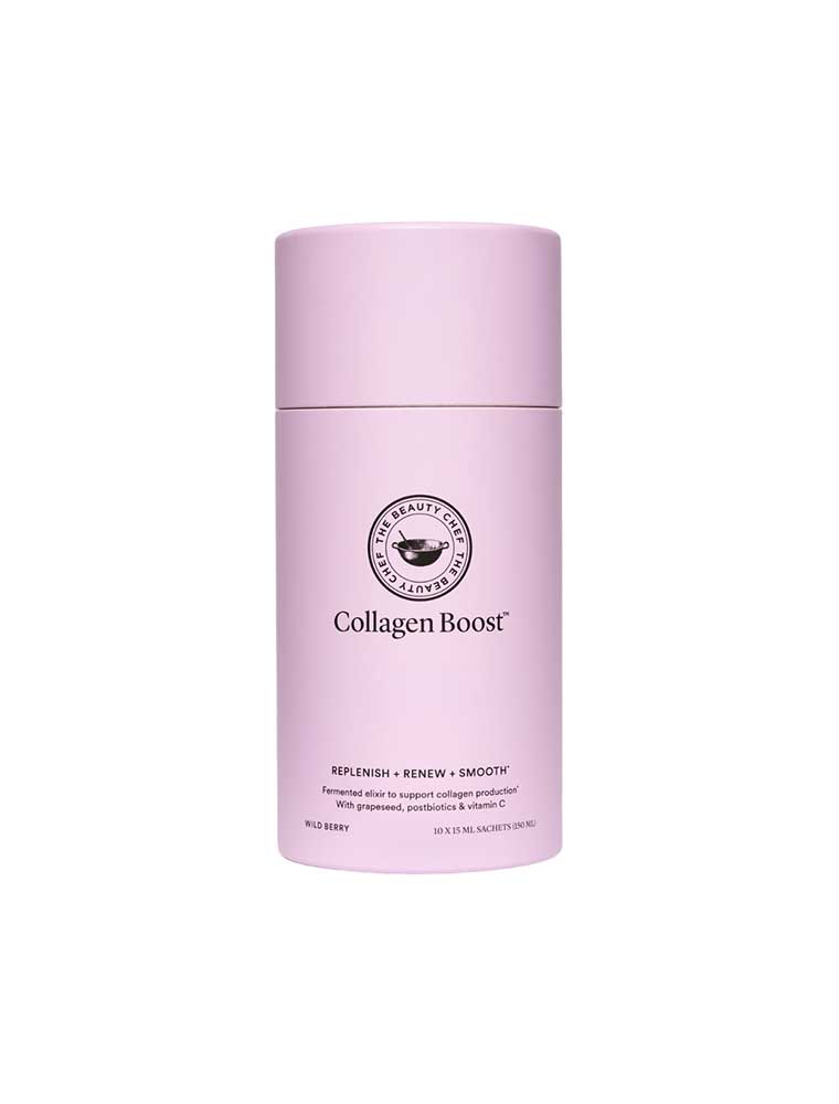 The Beauty Chef Collagen Boost™ Sachets allow you to enjoy the cult favourite collagen elixir anytime, anywhere with these on-the-go sachets. Each delicious wild berry-flavoured sachet contains a fermented vegan elixir for collagen production and healthy hair, skin and nails. This potent probiotic elixir contains plant-based extracts Grapeseed and Pomegranate, alongside Vitamin C and Zinc. The formula features Vitamin C to help protect from ageing free radicals, Zinc for healthy skin, hair and nails, plus antioxidant-rich Grapeseed and Pomegranate Peel Extracts. Contains prebiotics, probiotics and postbiotics for gut health and a healthy belly. This natural wild berry-flavoured elixir features skin-boosting Papaya, Grapeseed, Pomegranate and Queen Garnet Plum. Made in Australia and vegan.