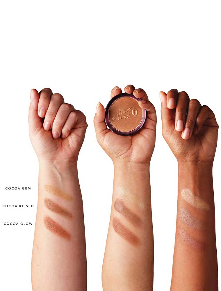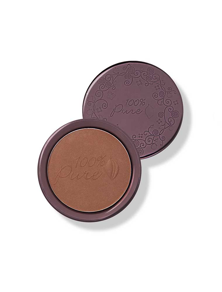 The 100% Pure Cocoa Pigmented Bronzer is formulated with Cocoa Powder and natural extracts. This light-weight baked powder is highly pigmented for a long lasting sun kissed glow with subtle shimmer from luminescent gems and minerals. Coloured with cocoa and coffee powder plus antioxidant-rich ingredients including Acai, Black Tea, Tomato and natural extracts. The concentrated formula provides buildable coverage for creating a warm, natural-looking complexion. Made in the USA and vegan.