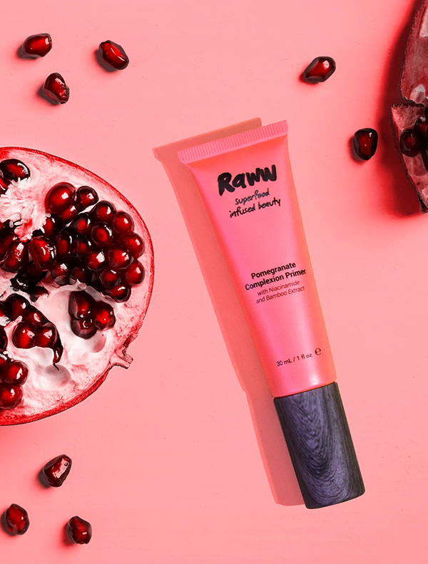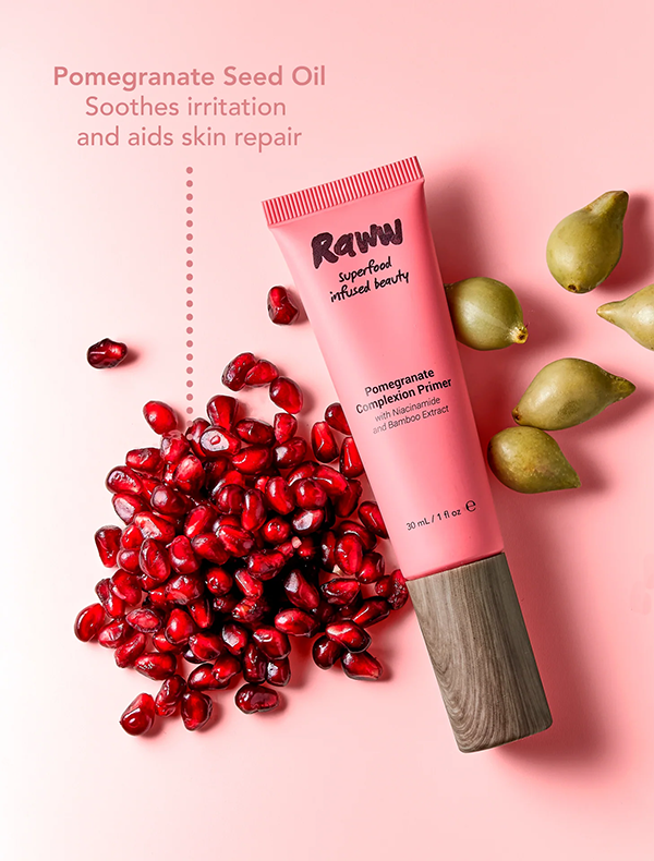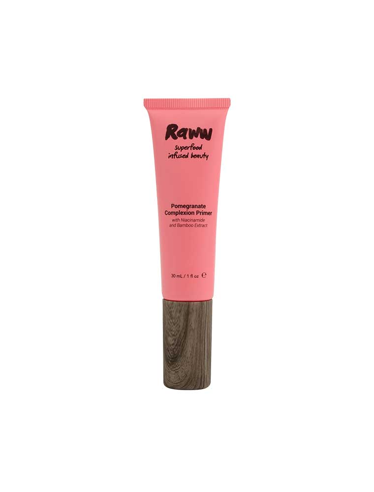 The Raww Pomegranate Complexion Primer is designed to create a smooth base for your makeup. This skin-perfecting primer is infused with brightening Pomegranate Seed Oil, which helps enhance youthful skin. It is also infused with strengthening and soothing Bamboo Extract, plus Niacinamide (Vitamin B3). Niacinamide is known for its skin conditioning properties and ability to help balance moisture levels. Great for all skin types, including sensitive, this primer perfects your base for perfectly flawless makeup and nourished skin all day long. Made in Australia and vegan.
