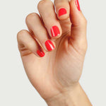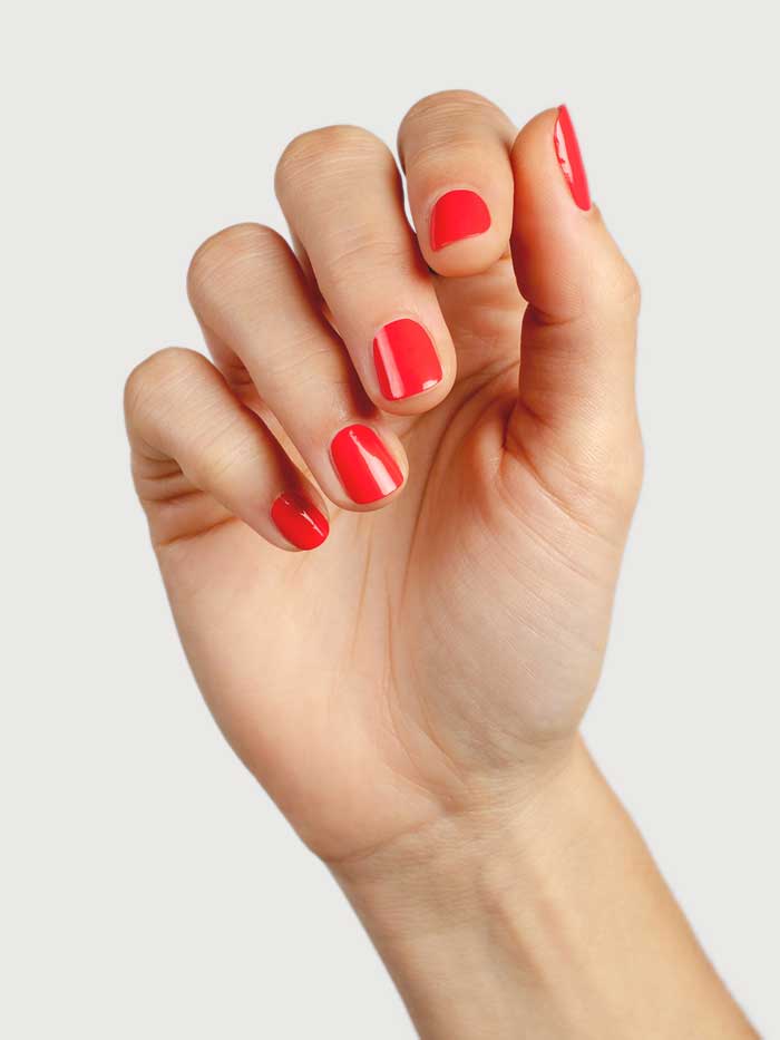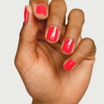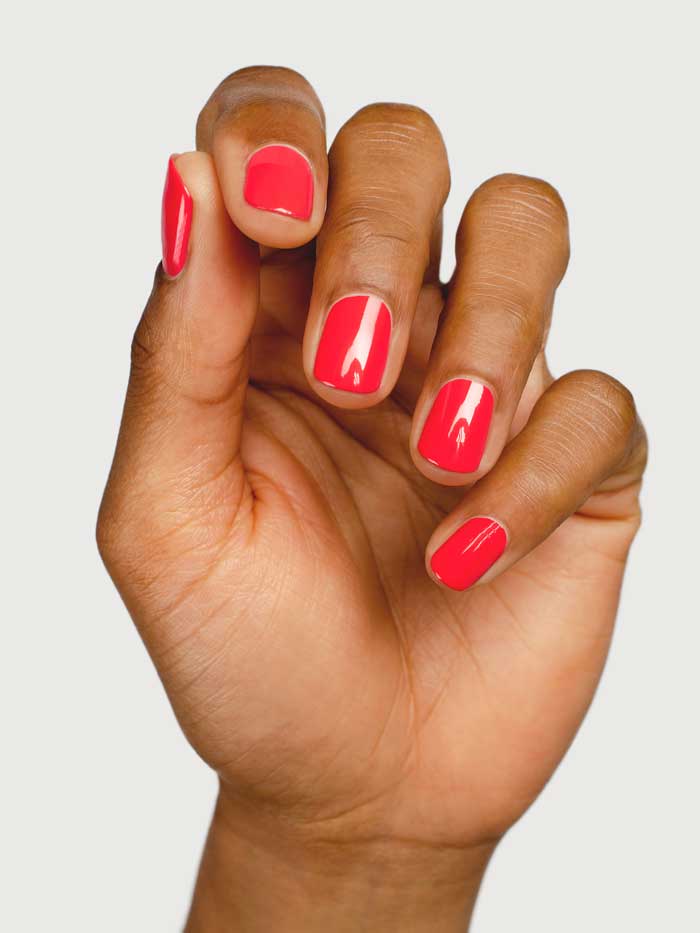 • Bold warm coral nail colour