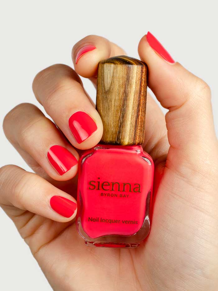 Sienna Byron Bay nail polishes are made with a natural plant-derived formula created from sugarcane, cassava, cotton and corn. Beautifully finished with sustainably sourced timber caps.