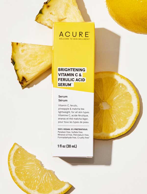 The Acure Brightening Vitamin C & Ferulic Acid Oil Free Serum is a powerful, lightweight daily formula designed to enhance skin radiance and improve overall skin tone for all skin types. This easily absorbed formulation combines the brightening properties of Vitamin C with the antioxidant benefits of Ferulic Acid. Plus the enzymatic action of Pineapple Extract and nourishing Papaya. Together, these ingredients work synergistically to help smooth the appearance of fine lines and uneven skin tone while supporting a luminous glow appearance. Made in the USA and vegan.