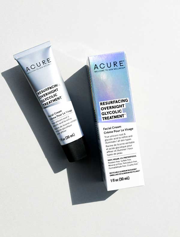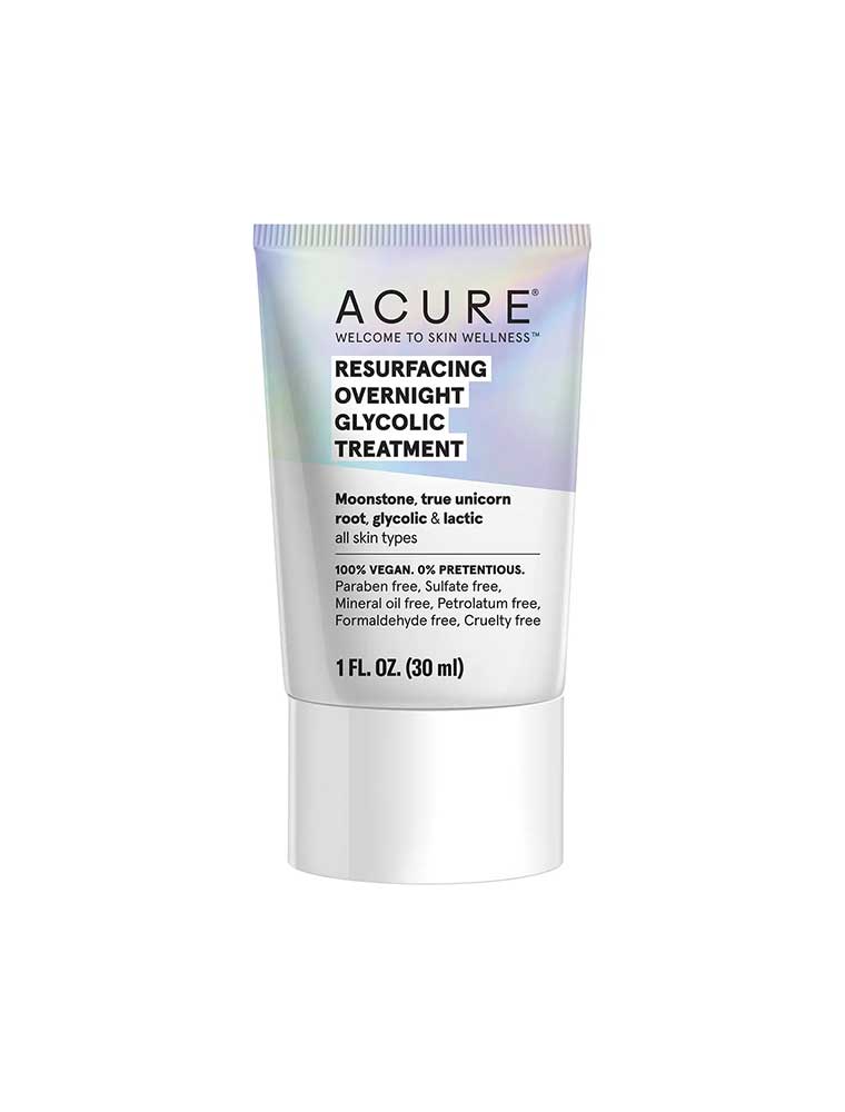 The Acure Resurfacing Overnight Glycolic Treatment is an innovative overnight treatment designed to leave skin radiant and dewy, suitable for all skin types. This formula combines Glycolic Acid and Lactic Acids to provide gentle exfoliation that helps promote skin cell production and improved skin texture while you sleep. Hemp Seed Oil, True Unicorn Root, and Moonstone Extract work to deeply hydrate and nourish the skin while helping to renew and retain moisture throughout the night. The lightweight treatment works overnight to visibly improve skin tone and texture, resulting in a refreshed, glass-like finish by morning. Made in the USA and vegan.