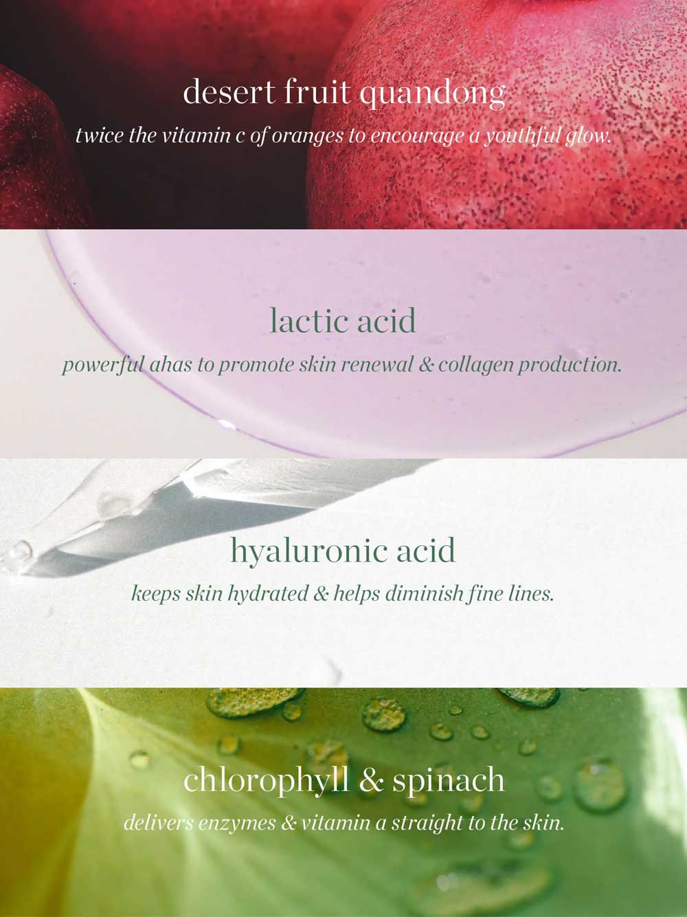 aqua, glycerin*, levulinic acid, sodium levulinate, santalum acuminatum (quandong) fruit extract, medicago sativa (alfalfa) leaf extract, rubus idaeus (raspberry) seed oil, spinacia oleracea (spinach) leaf extract, simmondsia chinensis (jojoba) seed oil, helianthus annuus (sunflower) seed oil, chlorophyllin-copper complex, lactic acid, p-anisic acid, sodium hyaluronate (hyaluronic acid), resveratrol, caprylhydroxamic acid, tocopherol (vitamin e), xanthan gum.