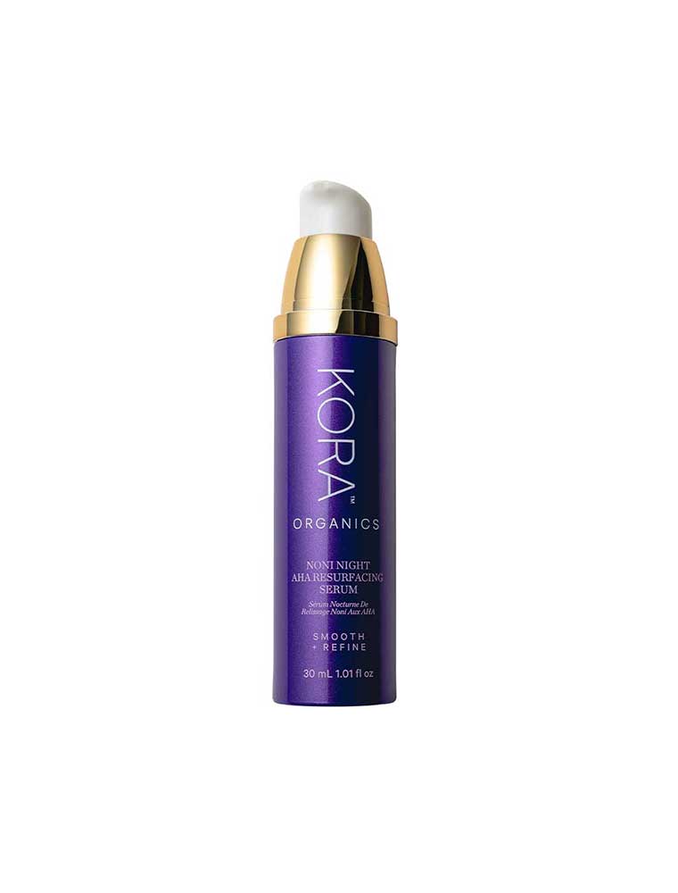 The KORA Organics Noni Night AHA Resurfacing Serum is a gentle but powerful resurfacing serum formulated with natural AHAs designed to brighten and smooth the skin tone. It contains plant-based lighteners including Willow Bark, Lemon Peel and Caviar Lime, plus Hyaluronic Acid and Tonka Bean for antioxidants and hydration. Clinical results show 91% noticed pores appeared smaller, 91% noticed the appearance of hyperpigmentation were minimised, and 91% noticed overall skin appeared more youthful. (Based on a study of 53 consumers, ages 25-55 using Noni Night AHA Resurfacing Serum nightly over a 4-week period). Made in the USA, certified organic and vegan.