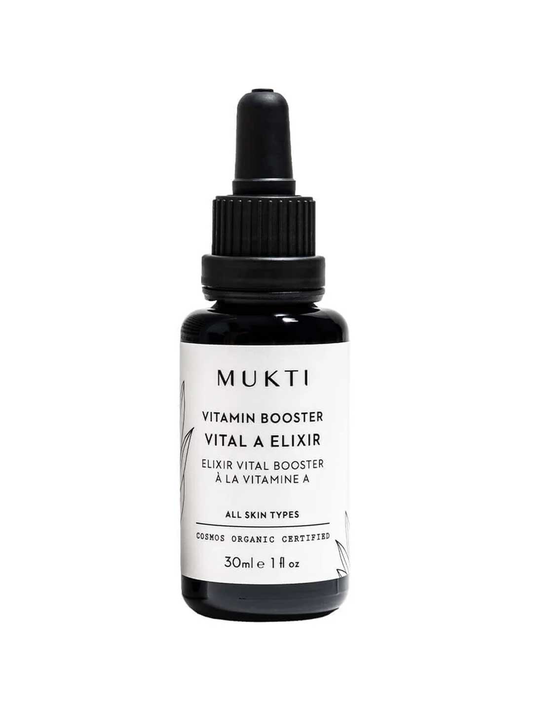 The Mukti Vitamin A Elixir is a plant based bakuchiol serum and anti-ageing retinal serum designed for powerful yet gentle skin renewal. This organic clean bakuchiol serum features a 100% botanical-based Retinal, clinically shown to work 11 times faster than regular retinols. Unlike traditional Vitamin A products, this elixir can be used any time of day without risk of irritation. The formula combines Retinal and Bakuchiol to increase cell turnover, effectively smoothing the appearance of fine lines, reducing the appearance of hyperpigmentation, and brightening the skin. Enhanced with plant-based antioxidants from Buriti, Rosehip and CoQ10 to resurface and refine skin tone. Suitable for all skin types, including sensitive skin. Free from silicone and mineral oil. Made in Australia, certified organic, vegan and packaged in glass.