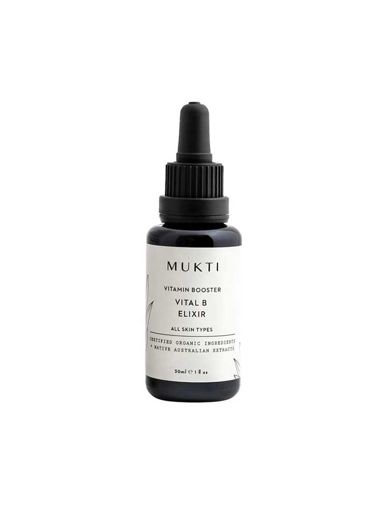The Mukti Vitamin B Elixir is a comprehensive skincare formulation designed to help soothe, hydrate, and support the skin's barrier. Created with Vitamin B3 (Niacinamide) and pro-Vitamin B5 (Panthenol), combined with Hyaluronic Acid for intense moisture retention. This lightweight serum targets multiple skin concerns, including hyperpigmentation and oil balance, while helping to protect against moisture loss. The formula also features Olive Leaf extract, rich in antioxidants and phytonutrients, to further support skin health. Made in Australia, vegan and packaged in glass.