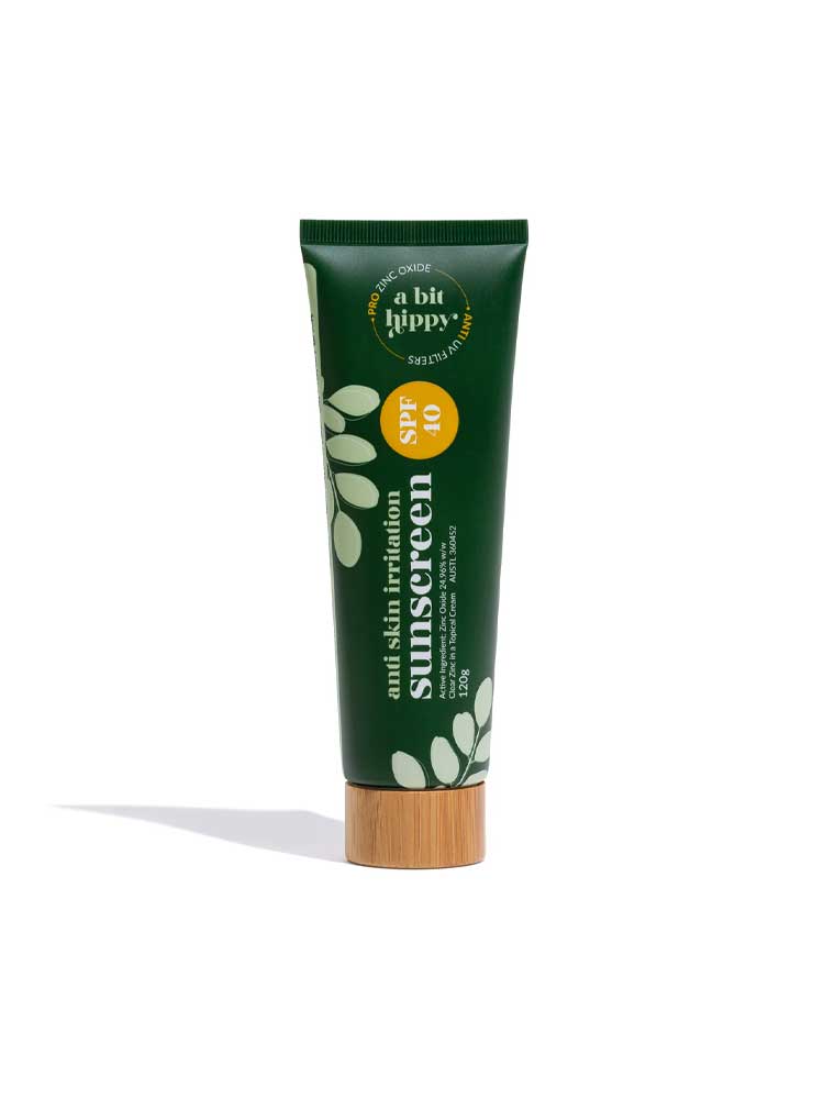 The A Bit Hippy Anti Skin Irritation Sunscreen SPF40 is a naturally derived zinc sunscreen that acts as a barrier to help reflect the sun's rays back into the atmosphere. Formulated with Zinc Oxide, this non-greasy sunscreen provides broad spectrum protection and is suitable for use on body, face, and sensitive skin. Gentle enough for babies and the whole family, this reef-safe formula is kind to both skin and planet. Perfect for outdoor activities while providing reliable sun protection. Made in Australia, vegan and TGA Listed (AUST L 360452). ALWAYS READ THE LABEL. FOLLOW THE DIRECTIONS FOR USE. Sunscreen is only one part of sun protection; wear protective clothing and seek shade. Avoid prolonged sun exposure and reapply frequently.