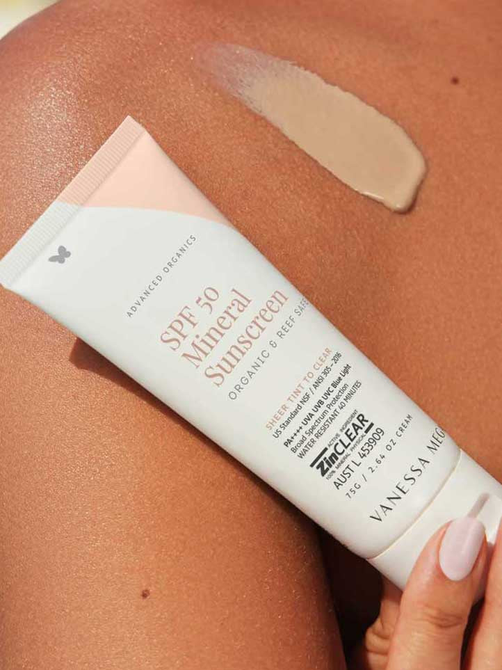 The Vanessa Megan SPF 50 Mineral Sunscreen is a high protection mineral sunscreen designed for both face and body use. Created with Zinc Oxide it provides broad-spectrum protection against UVA, UVB, and UVC rays. Formulated with hydrating Hyaluronic Acid and nourishing Sea Buckthorn, Jojoba Oil and Kakadu Plum to deliver a radiant, hydrating finish. This sunscreen has a sheer tint that blends into a clear finish, making it ideal for daily use and can be worn under makeup as both sunscreen and primer. Made in Australia and vegan. TGA Listed (AUST L 453909).