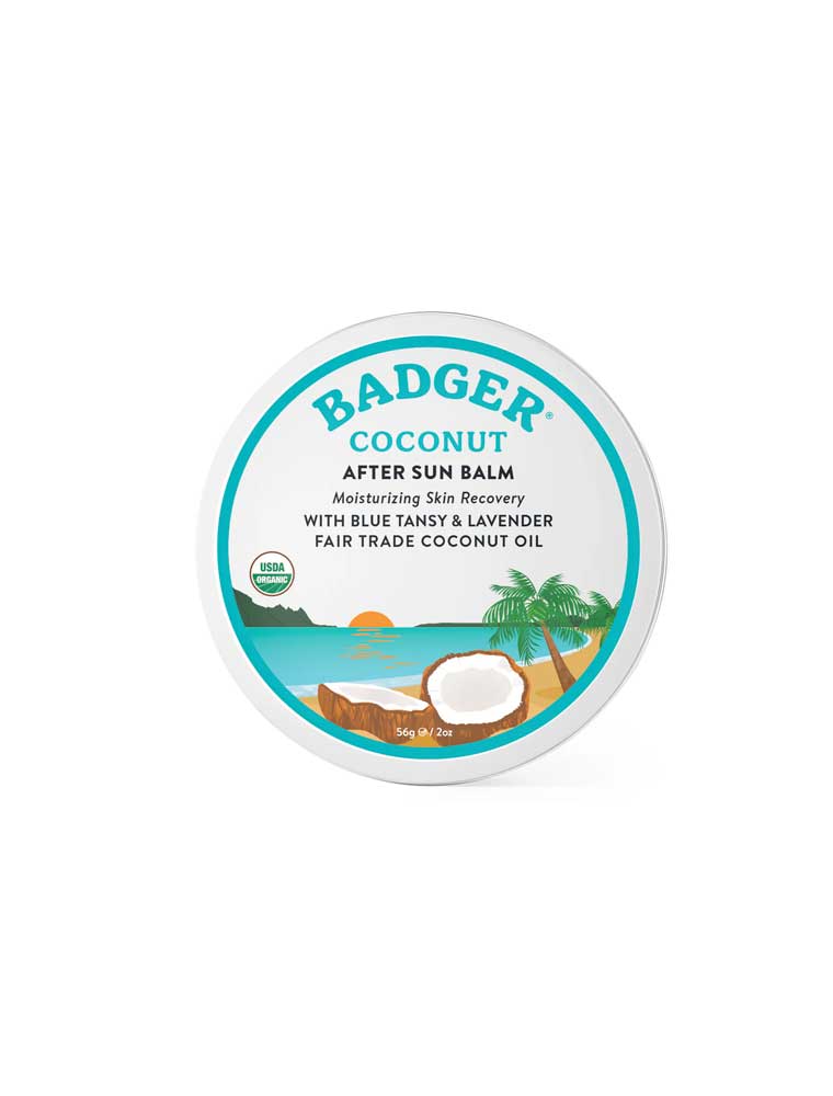 The Badger Coconut After Sun Balm provides soothing relief for sun-parched skin whilst nourishing, rebalancing, and moisturising your skin. This luxurious formulation features Fair Trade and organic Coconut Oil and Cocoa Butter blended with organic Shea Butter, Sunflower Oil, and Beeswax. Soothing Blue Tansy and Lavender pair with Ylang-Ylang to promote healthy skin whilst providing a lush tropical scent. Crafted with pure plant oils and butters, this balm moisturises and soothes sun-exposed skin to leave it feeling hydrated and refreshed. Free from parabens, sulfates, phthalates, artificial colour, or dyes, this clean formulation offers gentle yet effective after-sun care. Made in the USA and certified organic.