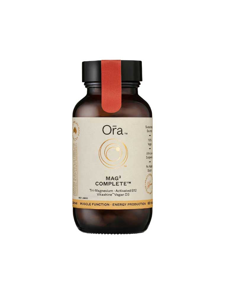 Ora Health Mag3 Complete is a comprehensive magnesium supplement designed for optimal absorption. It combines three forms of magnesium - amino acid chelate, citrate anhydrous, and glycinate dihydrate - to support muscle, nervous system, bone, and heart health. The addition of Vitashine™ vegan vitamin D3 supports immune function, while activated vitamin B12 aids in energy production.