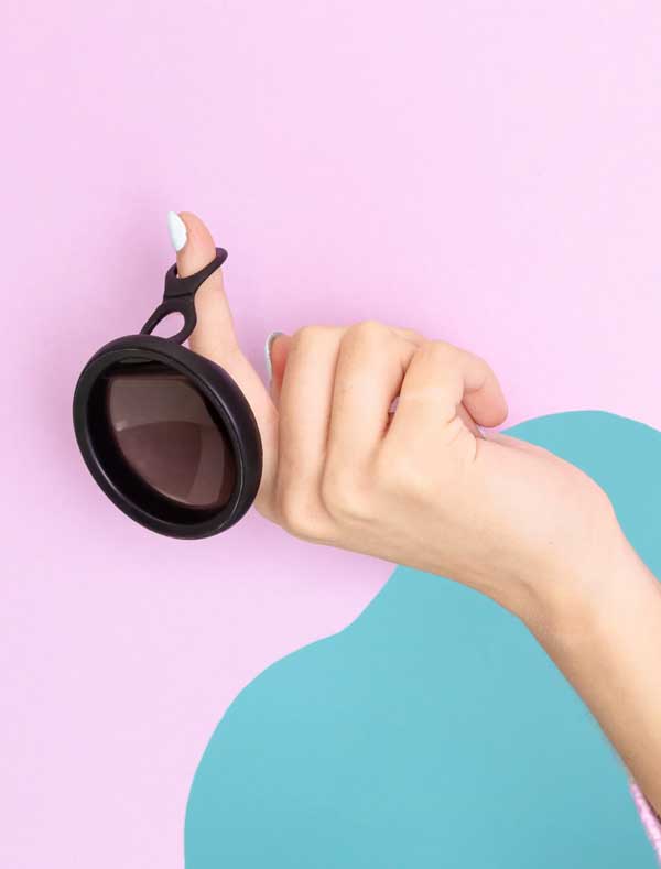 - Innovative menstrual disc in black with double-looped tab for easy removal