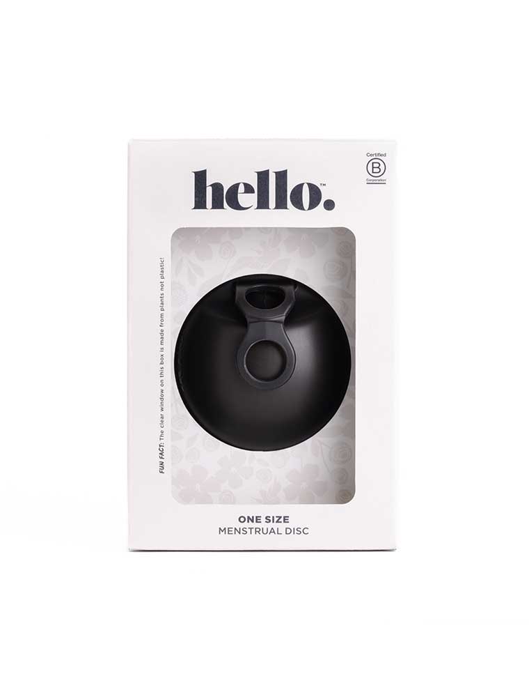 The Hello Disc Black is a menstrual disc co-designed by world-renowned menstrual cup and disc expert Kim Rosas and a Registered Nurse that features a double-looped tab for easy removal. Made from 100% premium medical-grade silicone, the Hello Disc provides hours of leak-proof protection and holds 50ml, equivalent to approximately 5 tampons. This handy 'one size fits most' disc with a 68mm diameter and 48mm looped tab sits higher than a menstrual cup and tucks behind the pubic bone. This disc suits all cervix heights and can be worn with an IUD. Unlike menstrual cups that use suction, the Hello Disc is held in place by being tucked behind the pubic bone and can be worn during intercourse. Made in New Zealand and vegan. Note: The Hello Disc is NOT intended to be used as contraception and will not prevent pregnancy. If you wear your Hello Disc during sexual intercourse and condoms are your sole method of birth control, remove your Hello Disc - the disc has not been tested against condom use and friction may create a micro-tear in the condom.