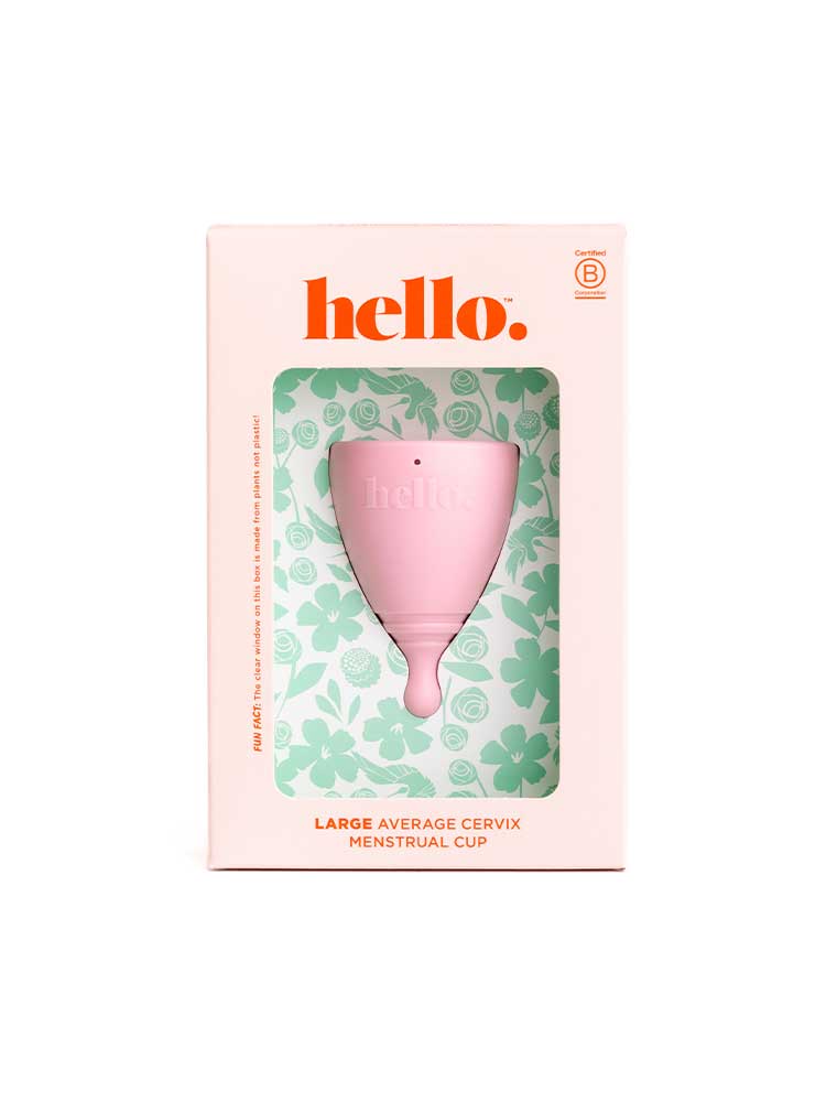 The Hello Cup is a modern menstrual cup designed by a Registered Nurse. It is made from hypoallergenic, medical-grade TPE (thermoplastic elastomer - the same material used to make catheters and intravenous lines for medical purposes). Once inside the body TPE warms and moulds to the user's body, creating a custom fit. This works slightly differently to traditional silicone cups which form a seal by having even pressure along the rim. TPE will still have some pressure on the rim but also adapts to fit the user's body. It holds approximately 3x the capacity of single-use tampons and pads. This Large size holds 29.5ml with a 45mm diameter and 64mm length, and comes in a blush pink colour. Suitable for those with an average cervix height. Made in New Zealand and vegan