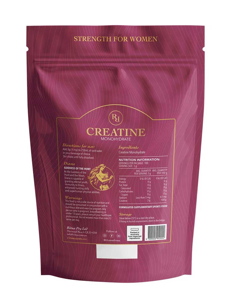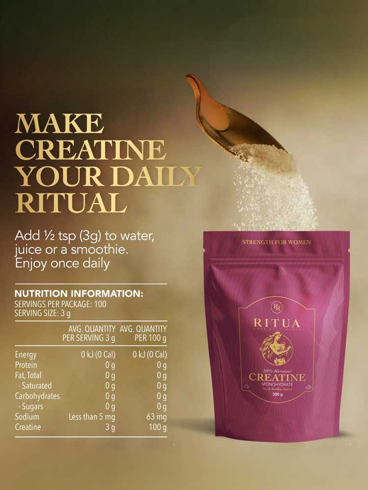 Ritua Creatine for Women is a pure, micronised Creatine Monohydrate formula designed to support strength, lean muscle tone, and faster recovery. This 100% pure micronised creatine features fine-grain powder for faster mixing and better uptake by your body, blending seamlessly into water, shakes or smoothies without affecting taste. Backed by research to support strength, recovery, and performance, this science-backed supplement is one of the most researched in the world, shown to improve recovery, boost strength and enhance training results. Whether you're a beginner or advanced, this versatile formula supports your performance goals and helps you feel stronger every day whilst maintaining energy. 100 serves per container for daily wellness routine support. Made in Australia.