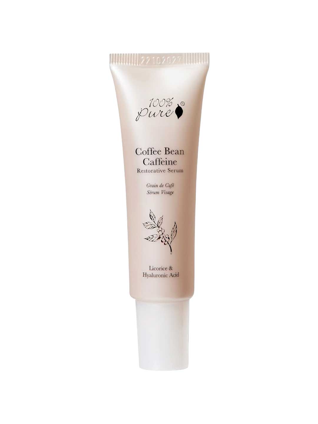 The 100% Pure Coffee Bean Caffeine Restorative Serum is a hydrating serum for all skin types, ideal for complexions with puffiness, lack of radiance and visible signs of ageing. Formulated with caffeine from Green Coffee to help depuff, tighten and brighten the skin through increased circulation, creating that post-exercise healthy glow and revitalised appearance. Enhanced with Green Tea EGCG to provide powerful antioxidant benefits, plus Liquorice Root to soothe and brighten the complexion. The formula also includes Hyaluronic Acid to lock in hydration for a plump, dewy appearance. Free from silicone and mineral oil. Made in the USA and vegan.