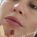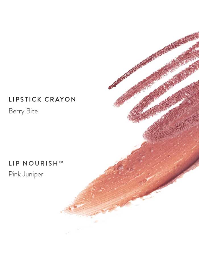 Pink Juniper offers a sheer, satin wash of dusky pink with hydrating Avocado, Cocoa Butter, and Jojoba. Berry Bite delivers full coverage with a creamy demi-matte finish and doubles as a lip liner for added shape and intensity. Worn alone or layered together, they create both everyday nude-berry looks and deeper, more dramatic tones.