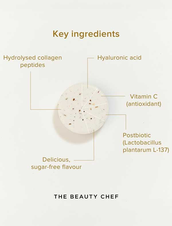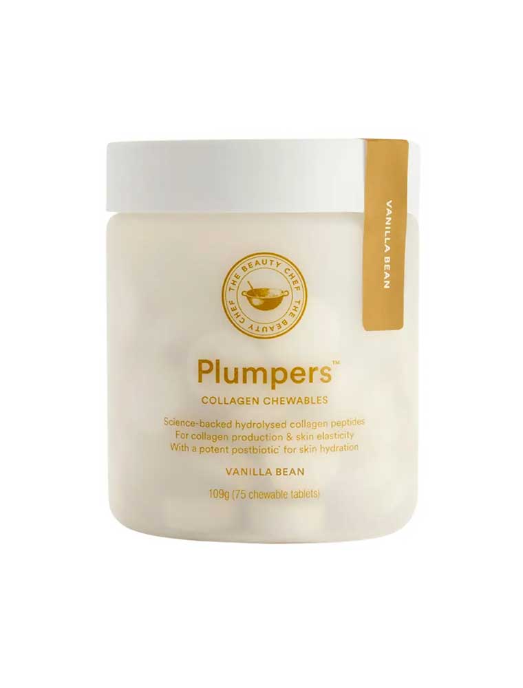 The Beauty Chef Plumpers™ Vanilla Bean are creamy vanilla chewable tablets to support collagen production, skin elasticity and hydration. These science-backed tablets feature Verisol™ hydrolysed collagen peptides with 1 serve (3 chewables) providing 2625mg collagen peptides to support collagen production and skin elasticity. Enhanced with potent postbiotic Lactobacillus Plantarum L-137 to support skin hydration and immune system health, plus highly absorbable Hyaluronic Acid. These convenient on-the-go chewables allow you to chew your way to sought-after skin anytime, anywhere. This smooth and creamy blend packs a Vanilla Bean flavour punch with no added sugar, artificial flavours or colours. Made in Australia.