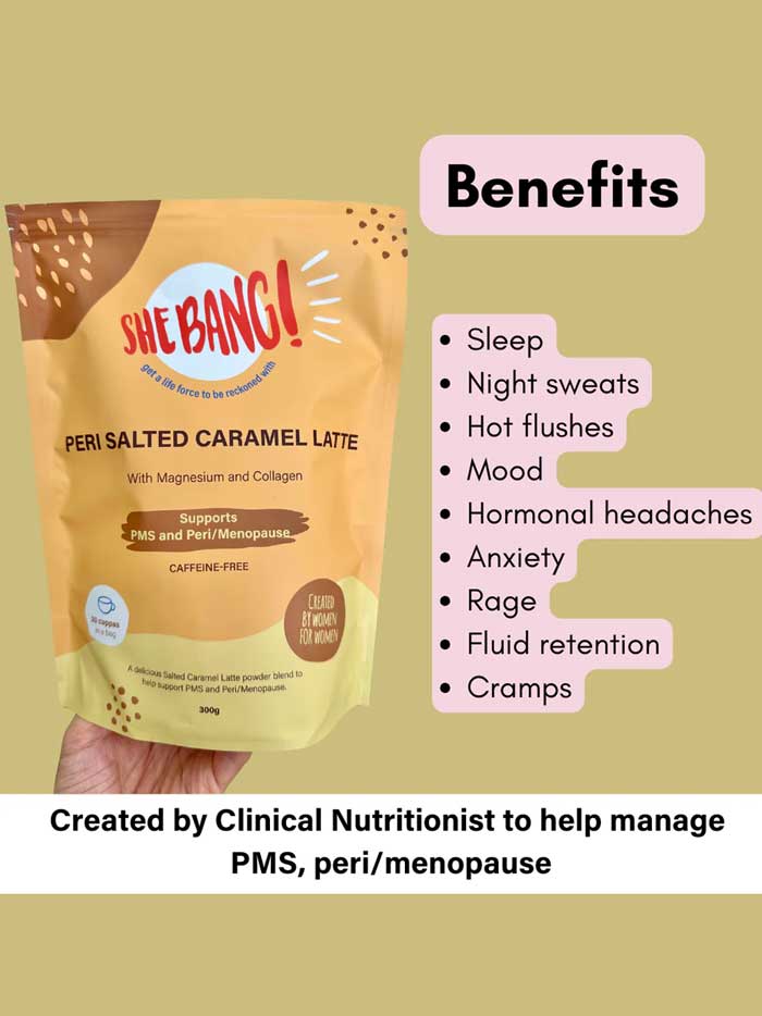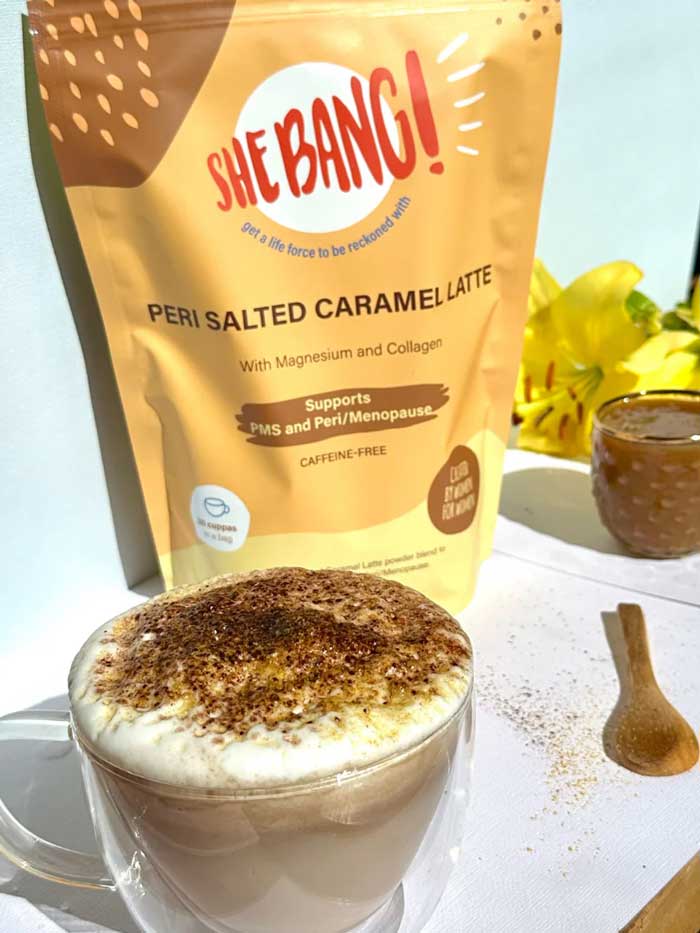 The She BANG! Peri Salted Caramel Latte is a functional latte blend loaded with Magnesium Glycinate and Collagen Peptides, created by a nutritionist specifically to help you feel the whole She Bang! through all the hormonal ups and downs. This keto-friendly blend manages great sleep, mood swings, hot flushes, night sweats, bloating and hormonal headaches whilst sustaining energy and maintaining bone and muscle health. With just 2.1g net carbs per serve and only 45 calories, this latte is perfect for ketosis with 31% collagen peptides for protein boost and healthy fats from coconut milk powder. Naturally sweetened with monk fruit extract and enhanced with French artisan sea salt for electrolyte support. 92% of customers report a reduction in their perimenopause issues. Made in Australia.
