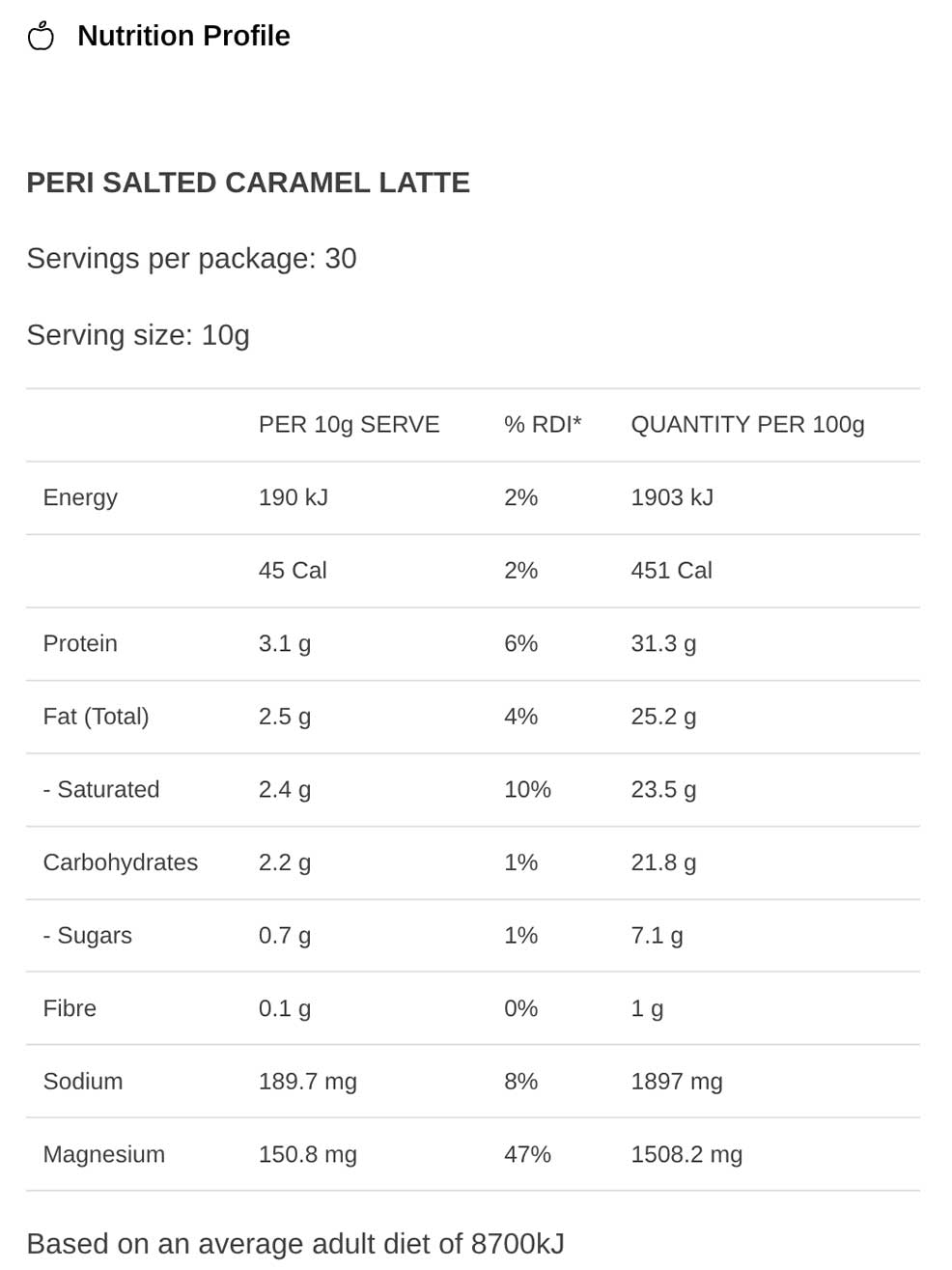 Simply add one serve of the Peri Salted Caramel Latte in a mug, add a little hot water, stir to dissolve. In a glass add a fistful of ice, pour over your choice of milk and finally the Peri Salted Caramel Latte mix you just made.