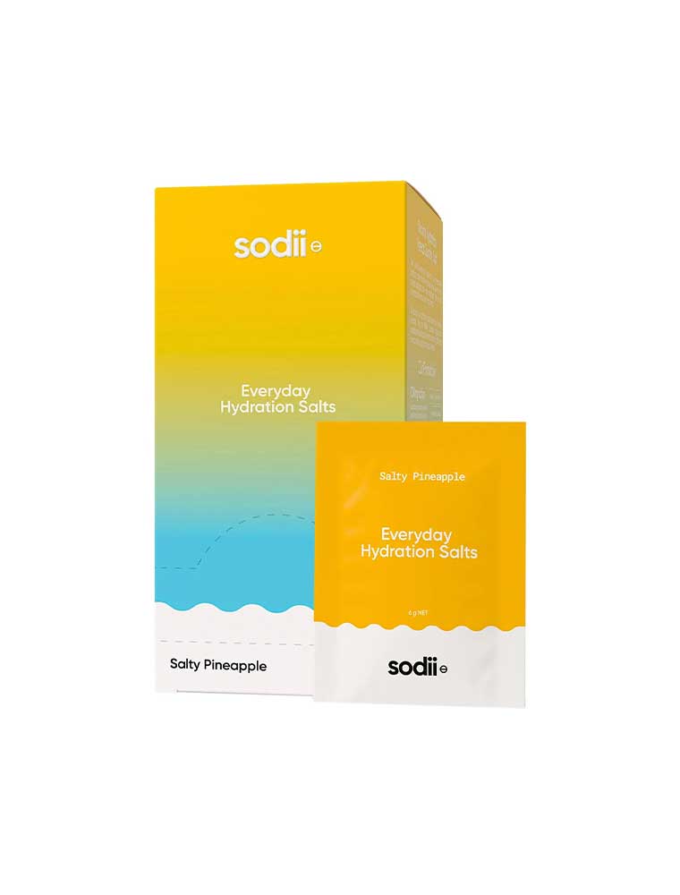 The Sodii Everyday Hydration Salts Salty Pineapple Sachets provide science-backed hydration on the go with this pack of 30 individual sachets. Each sachet delivers a delicious salty-tropical pineapple flavour alongside an optimal electrolyte balance of 1000mg sodium, 210mg potassium, and 70mg magnesium to support your performance, fluid balance, and overall health. Sourced from Lake Deborah in Western Australia, the unique 5-million-year-old ancient lake salt is naturally formed, free from pollutants, and rich in essential trace minerals. Simply mix one sachet with water to create a perfectly balanced hydration drink with a refreshing tropical taste, encouraging you to drink more water throughout the day. Made in Australia.
